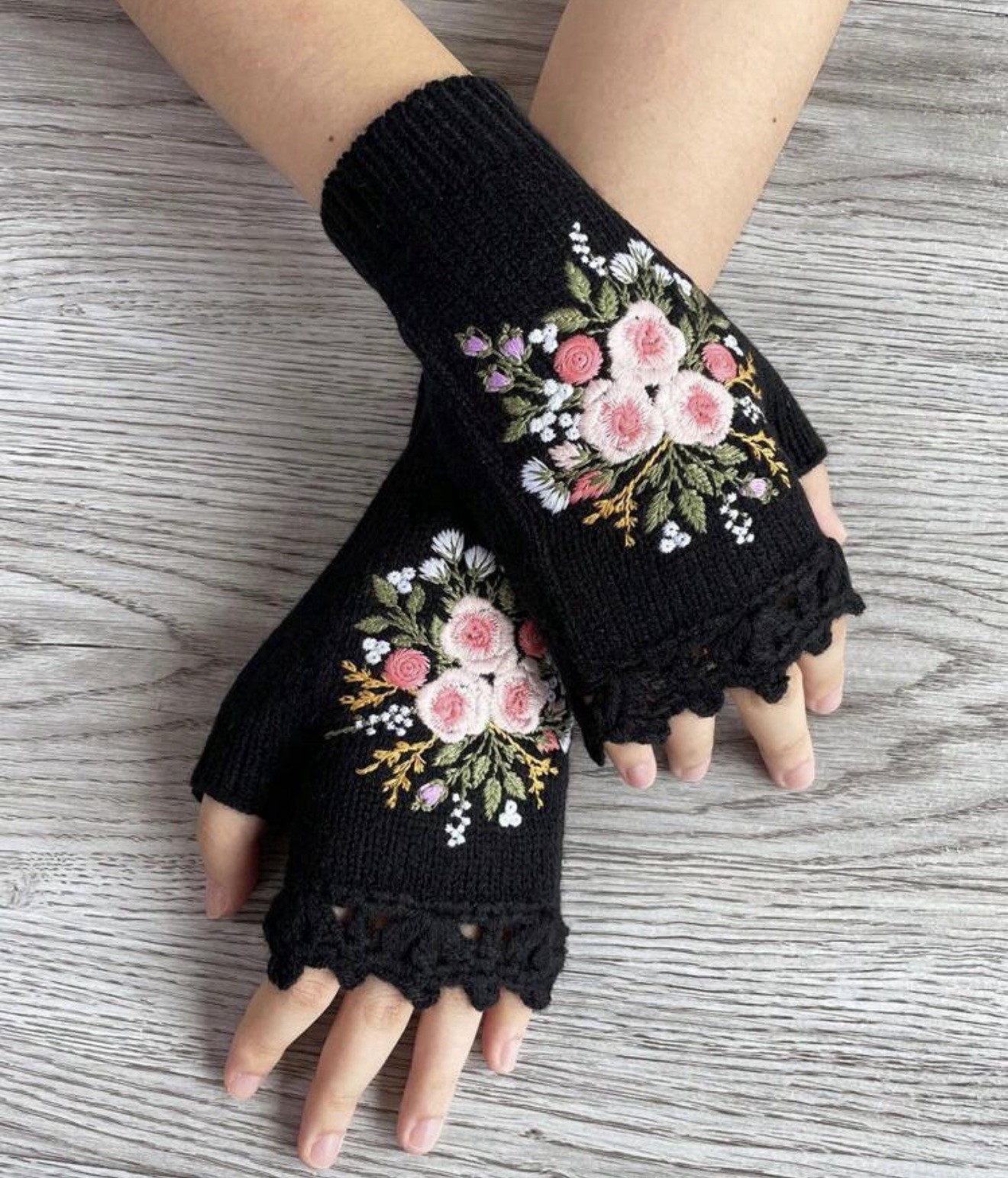 как выглядит Vtg Style Hand Crocheted Floral Embroidery Fingerless Gloves Pair фото