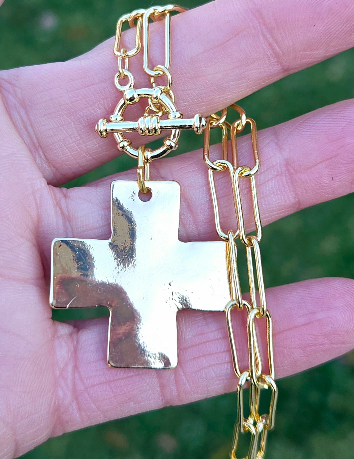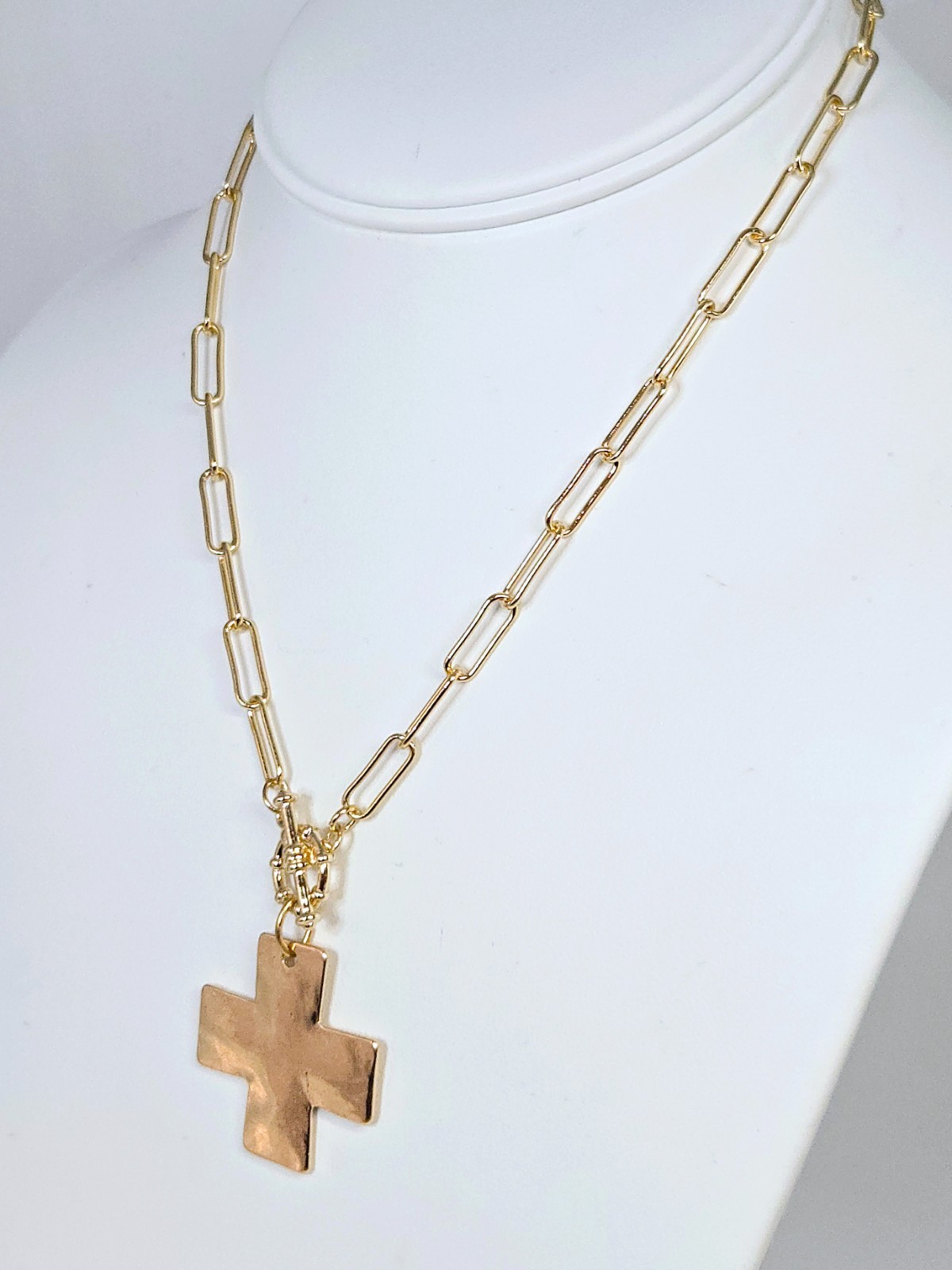 Gold Textured Cross Paperclip Chain Toggle Necklace Textured Pendant