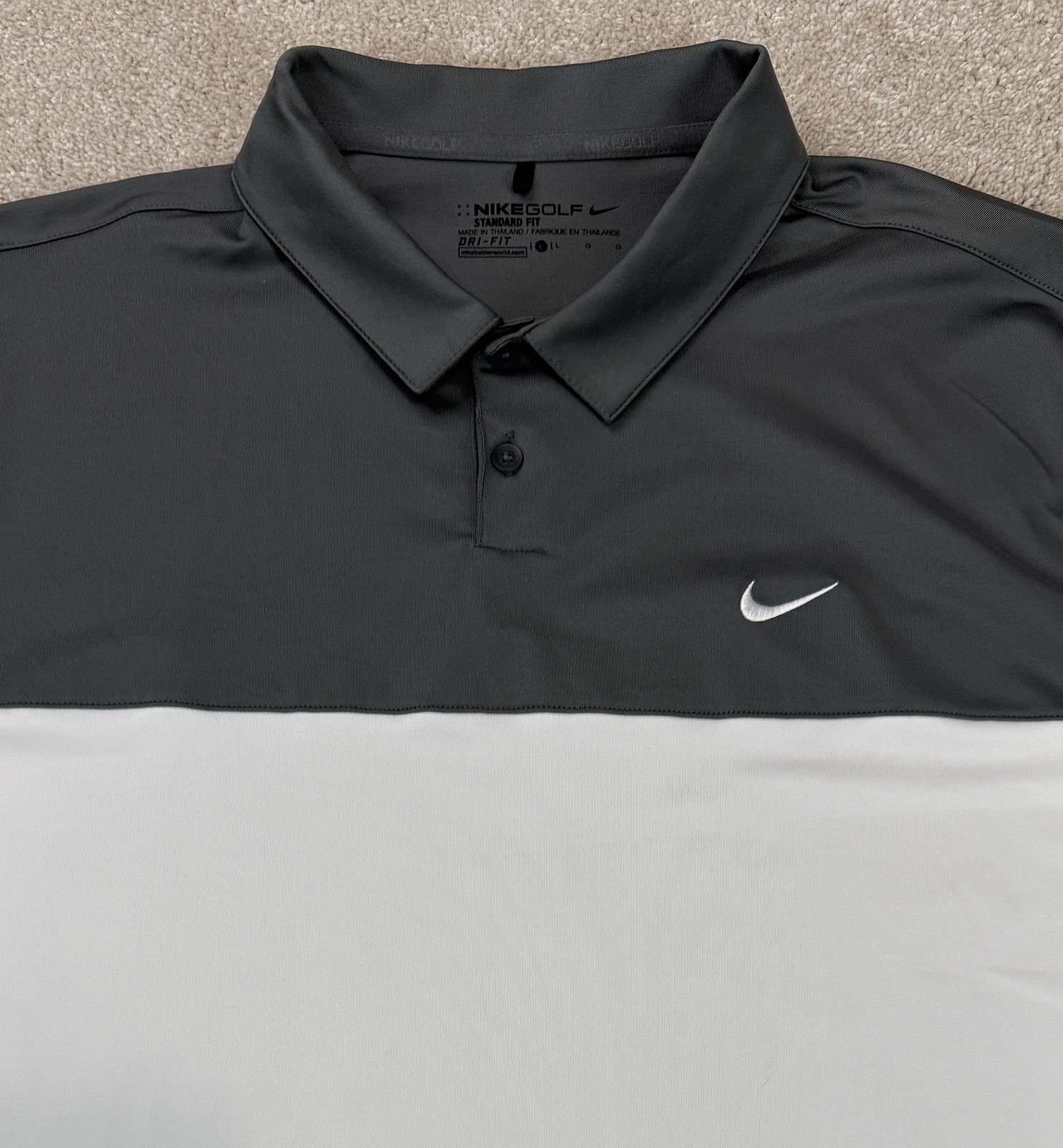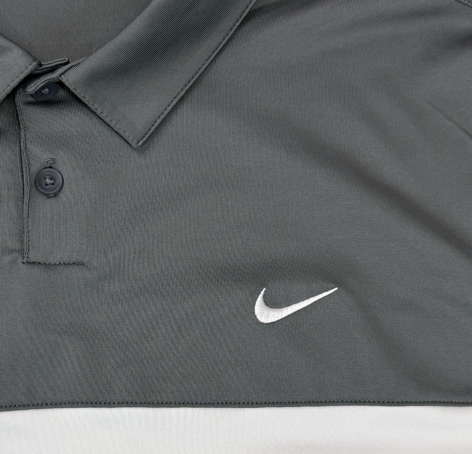 Nike Golf Dri- Fit Standard Men's Polo Shirt LARGE Gray White Swoosh Logo Preppy