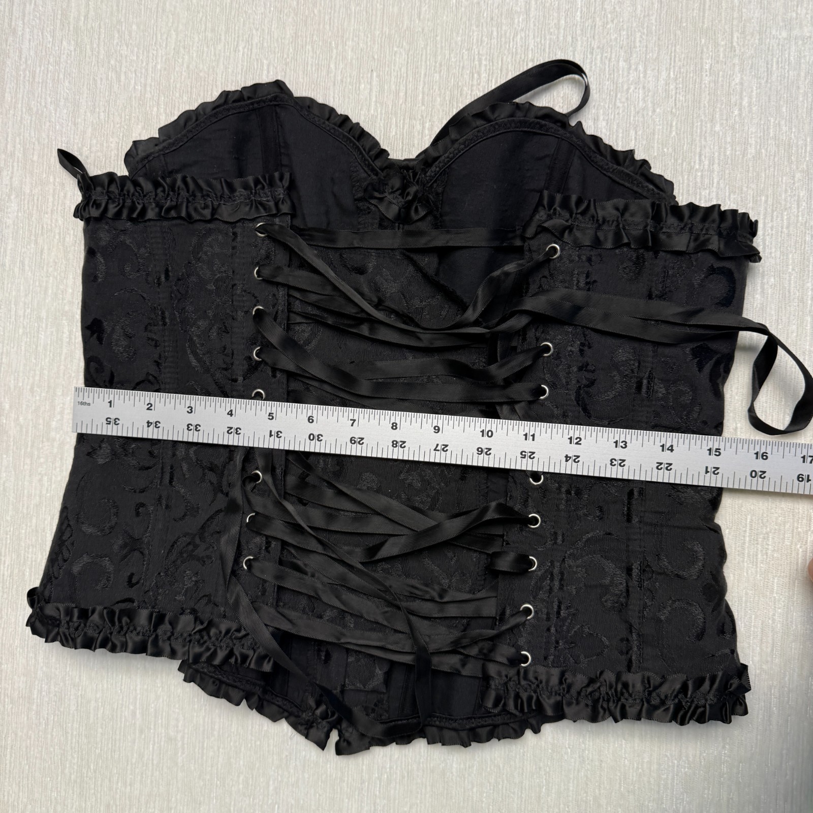 как выглядит Women Overbust Damask Corset Bustier Crop Top Medium Black Floral Ruffle Lace Up фото