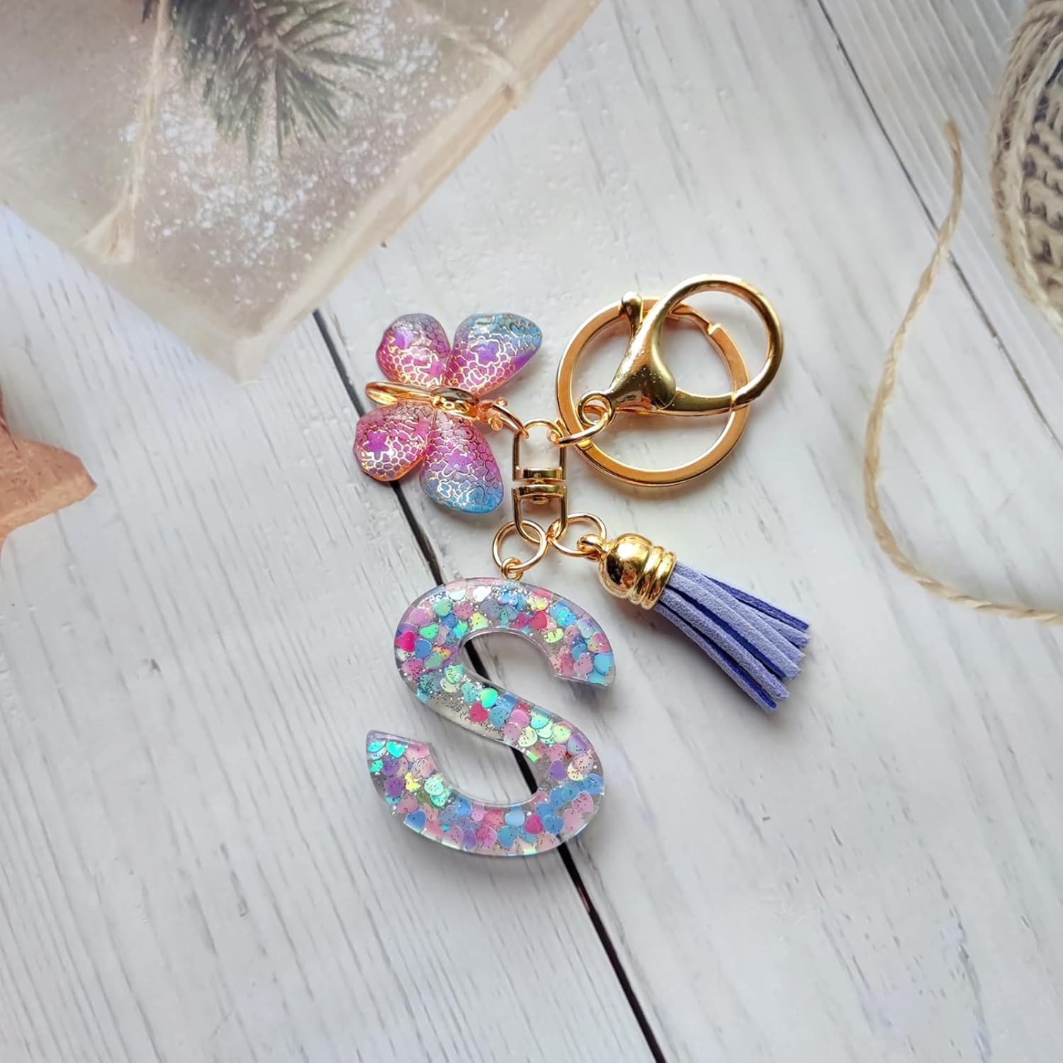 Cute Initial Letter Keychains for Women Girls Tassel Butterfly Pink Purple Green