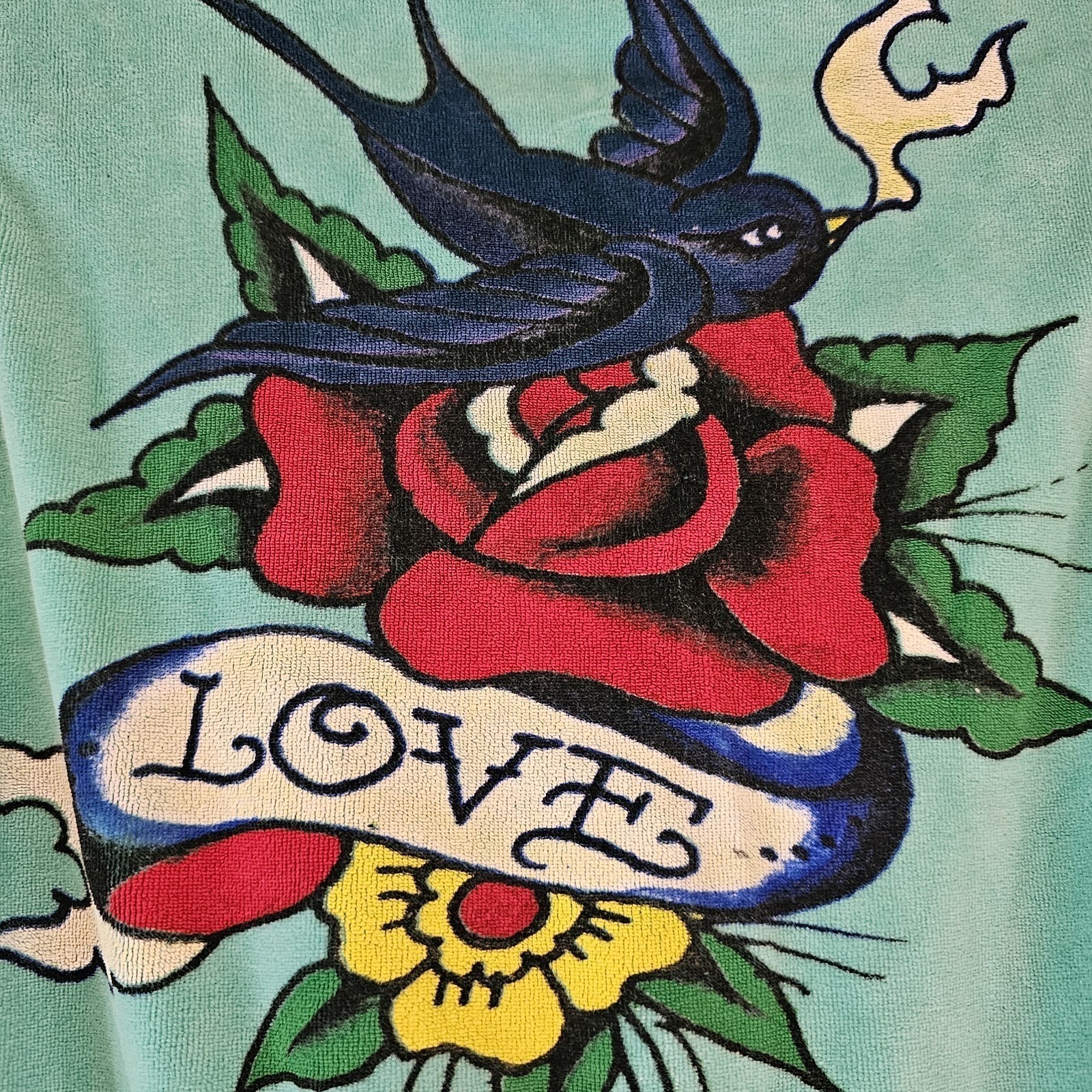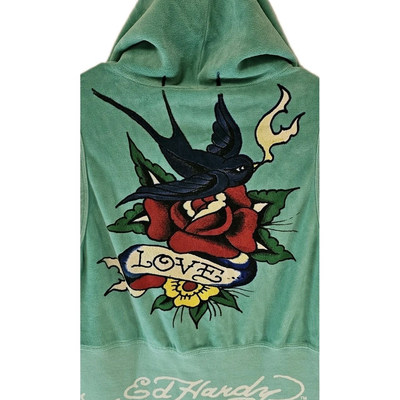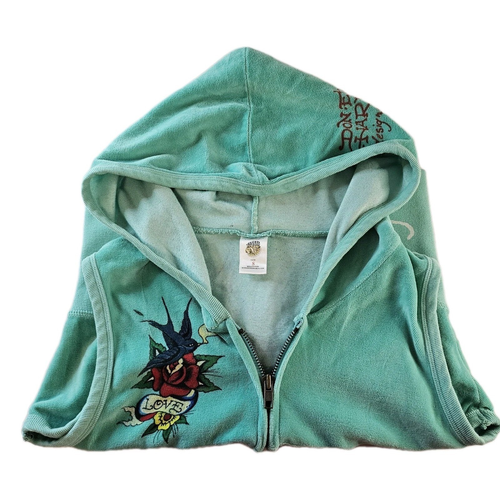 как выглядит Y2k Ed Hardy Teal Sleeveless Terry Hoodie Rose Tattoo Love Zip Up Vest Small фото