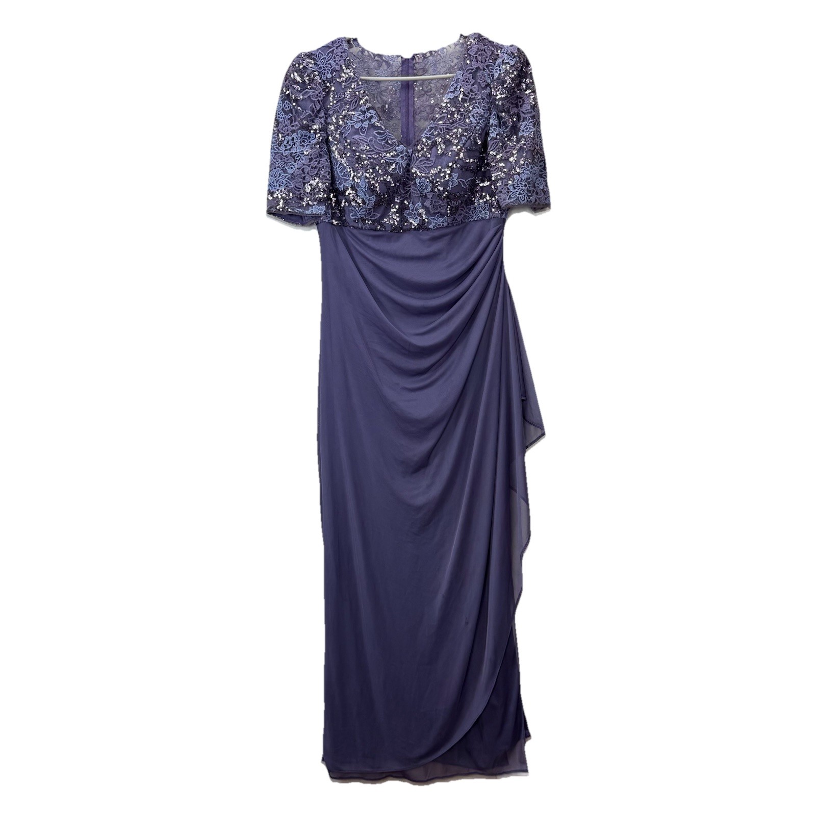 Alex Evenings Purple Sequin Short Sleeve Cascade Chiffon Dress Size 8 PETITE