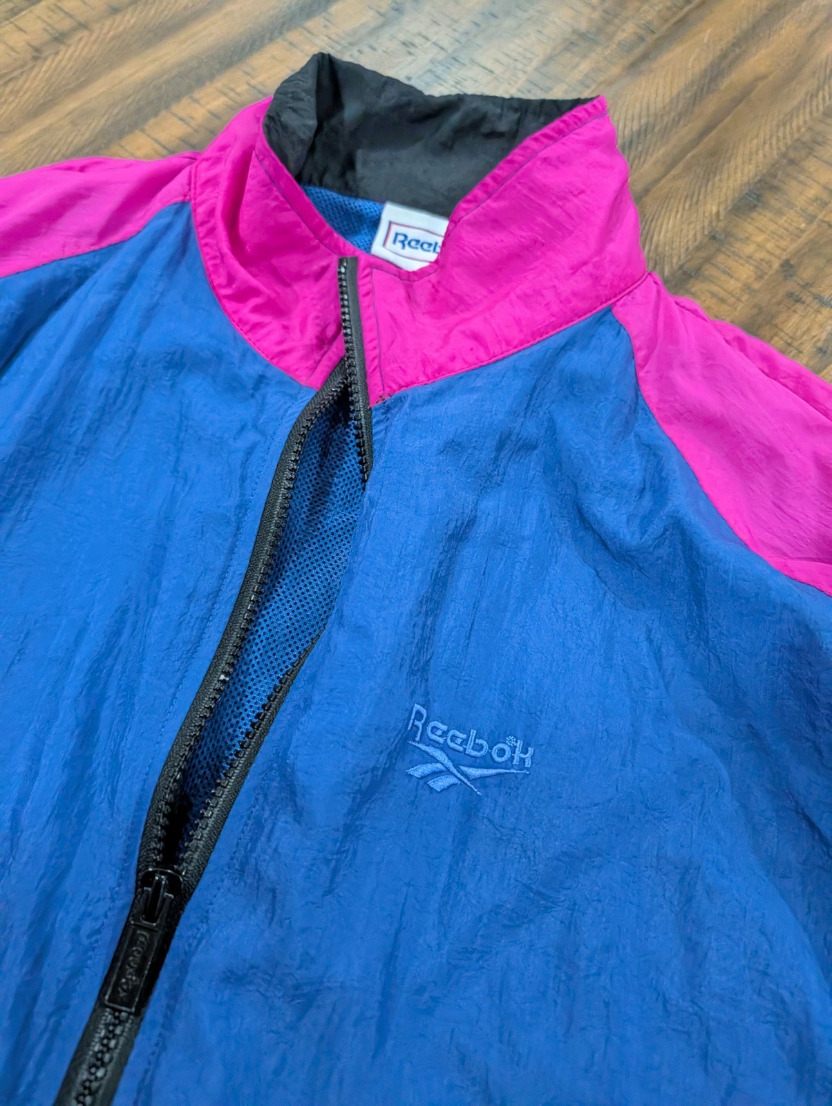 как выглядит Womans Vintage Reebok Nylon Windbreaker Jacket Pink Blue Black Medium 90s фото