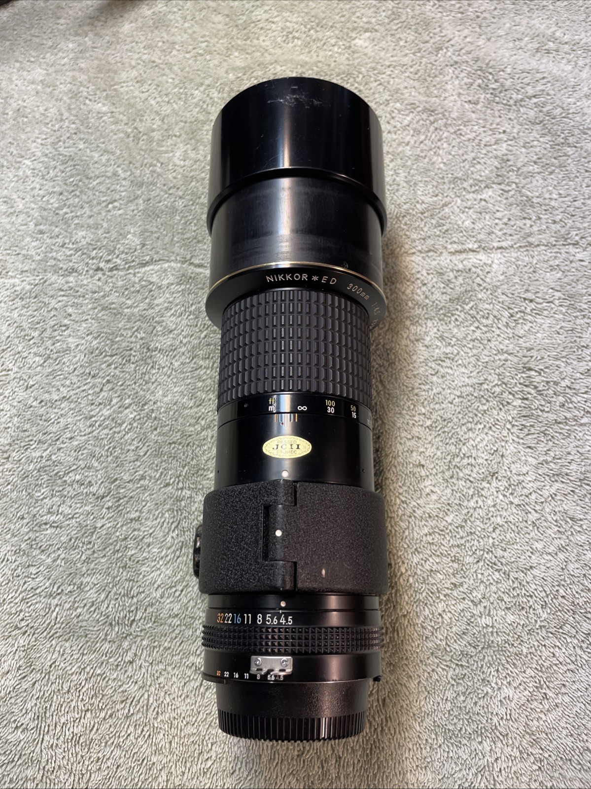 Nikkor AI-S 300mm f4.5 ED lens w/hood, 72mm Tiffen UV, tripod mount, F R Caps