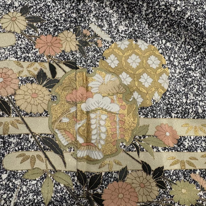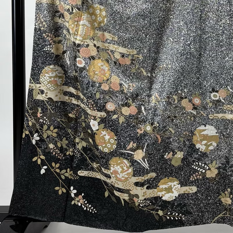 • Vintage Japanese Silk Kimono Robe Black Gray Yukiwa Floral Gold