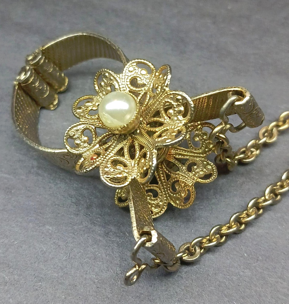 как выглядит Vintage 50s Gold Tone Filigree Faux Pearl Opera Glove Skirt Holder фото