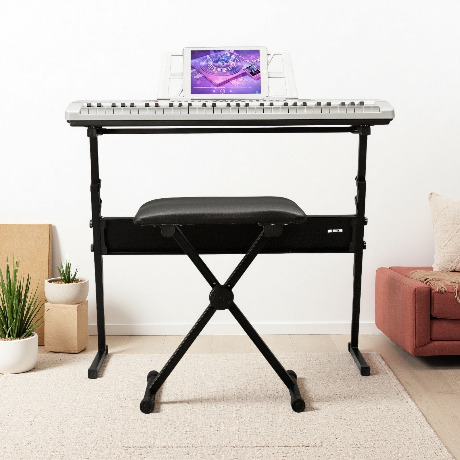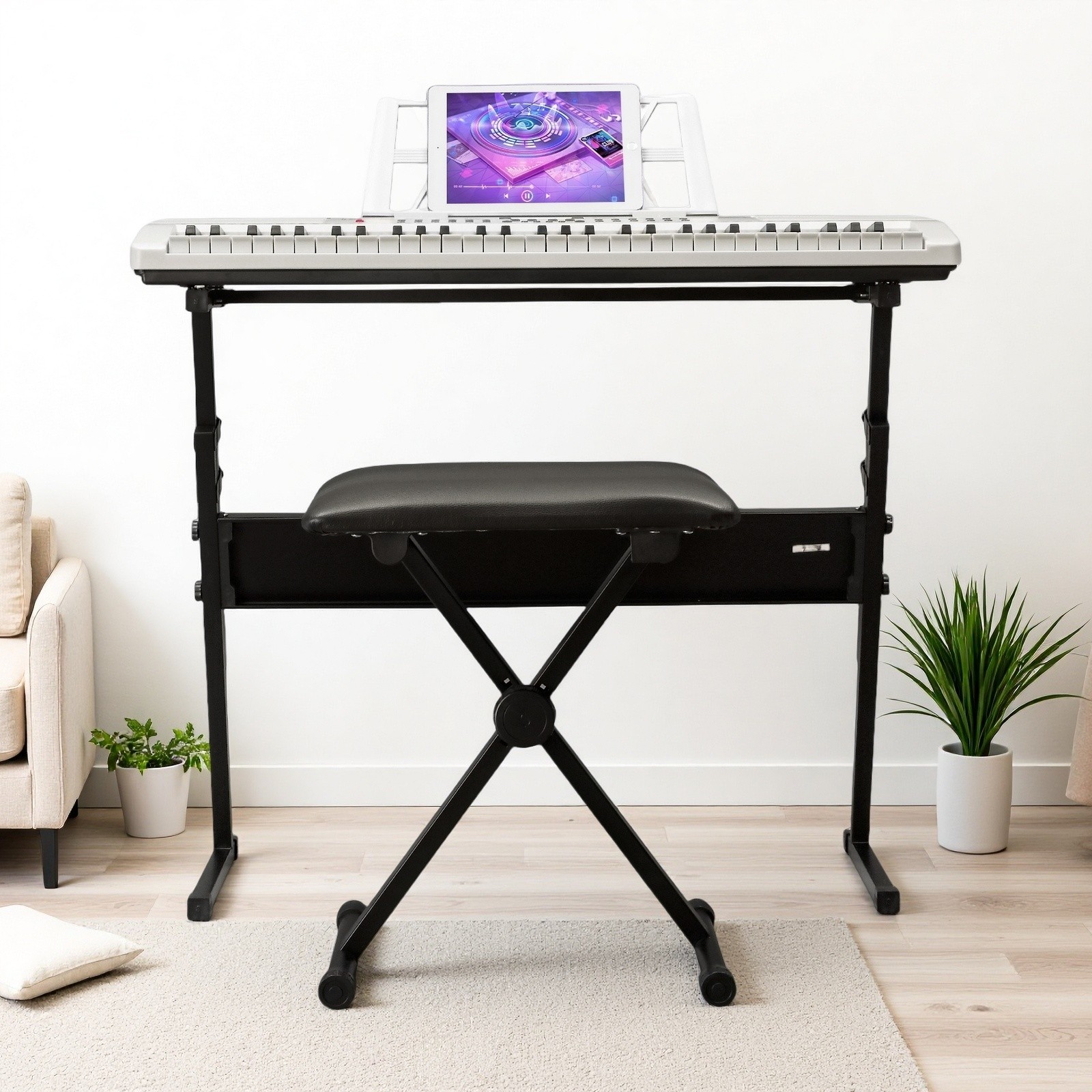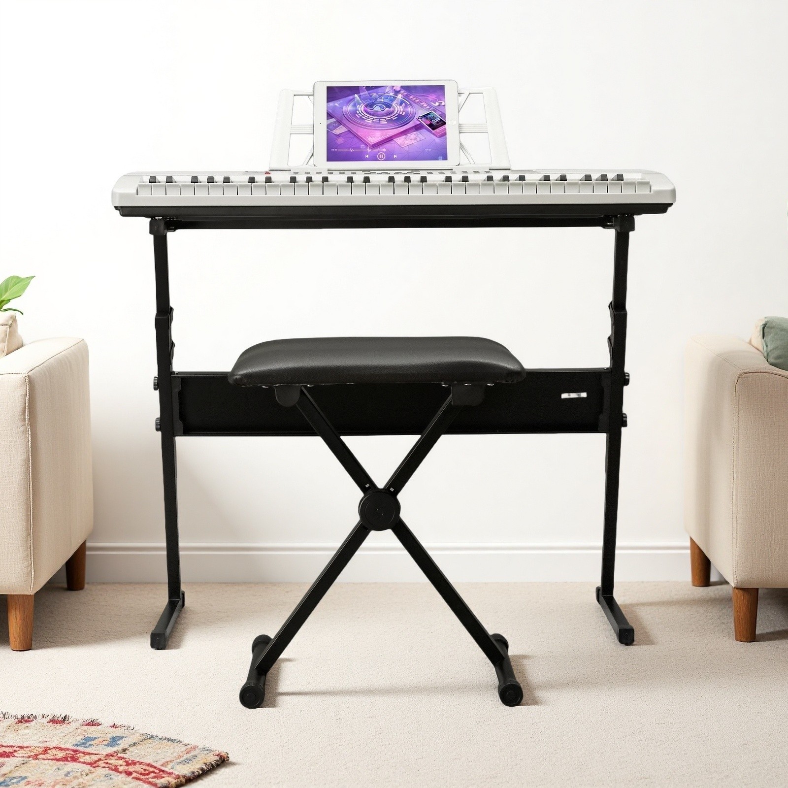 61-Key Light-Up Piano Digital Keyboard Set - White Z-Stand Bench Mic Headphones