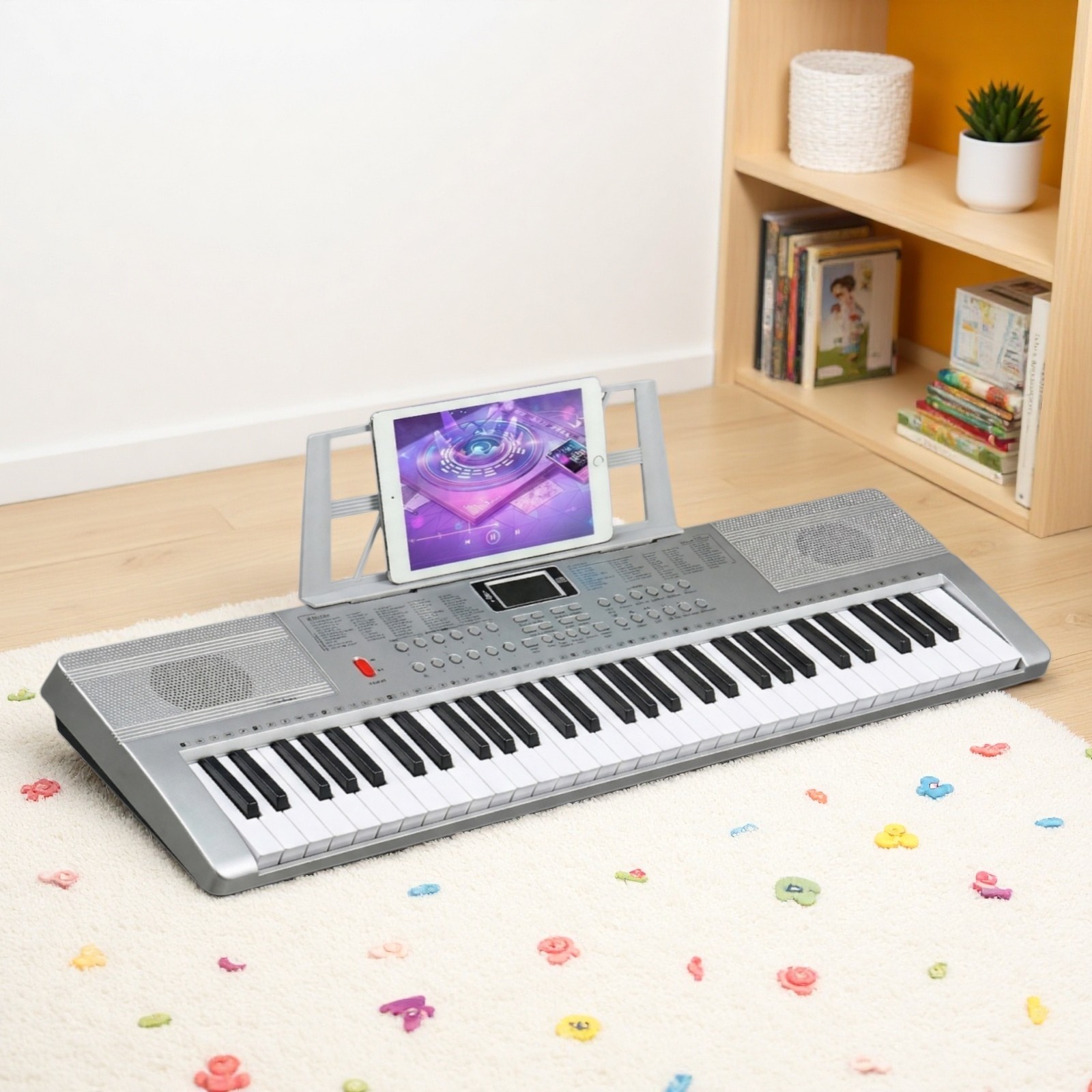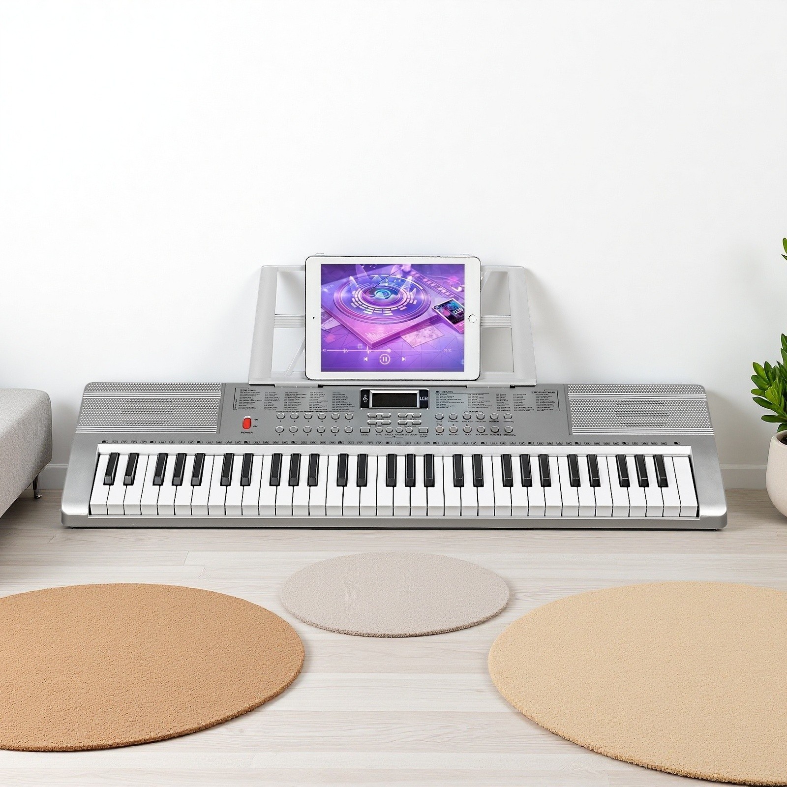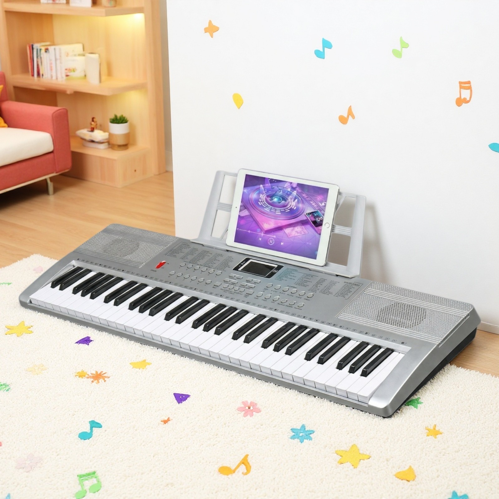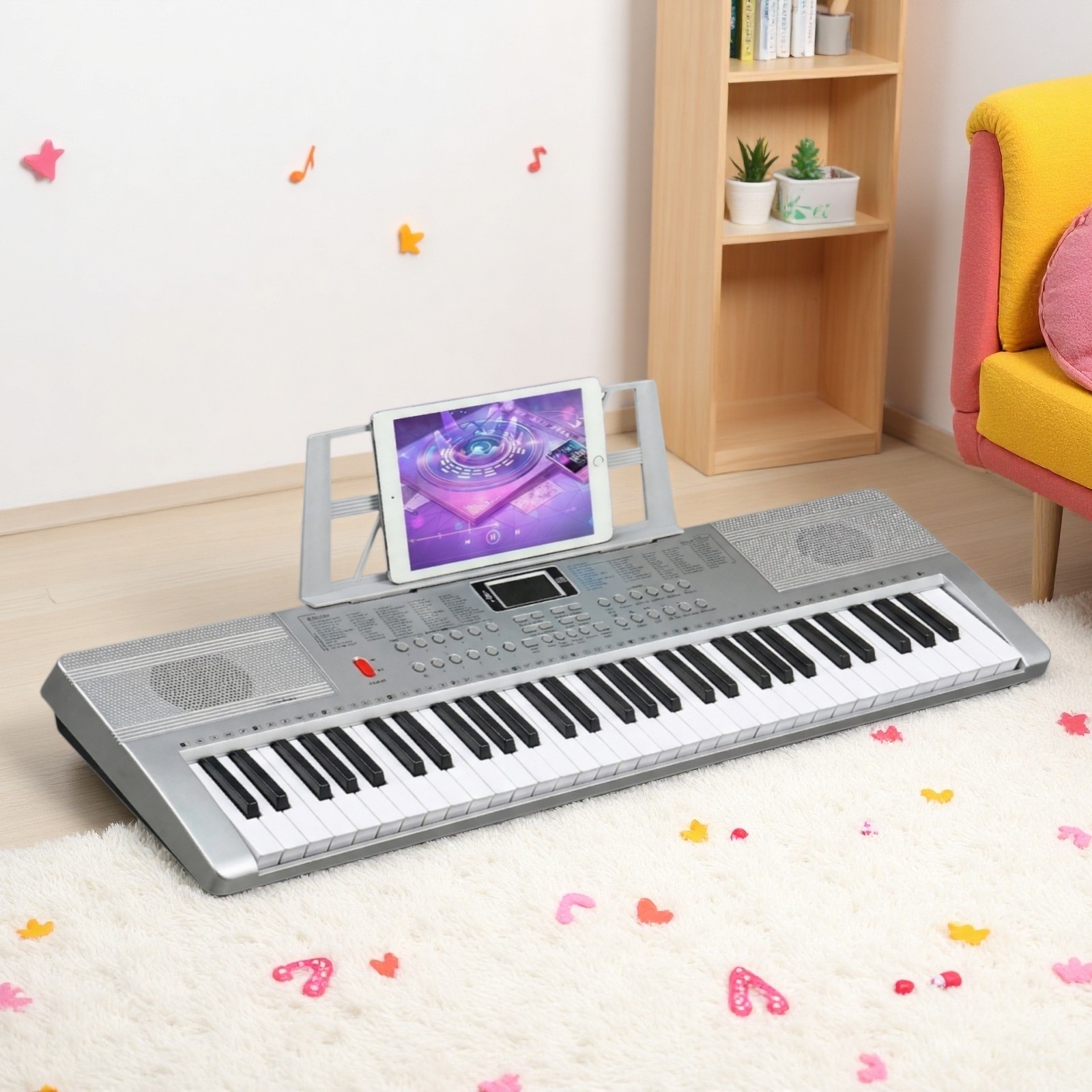 61-Key Light-Up Piano Digital Keyboard Set - Silver Z-Stand Bench Mic Headphones