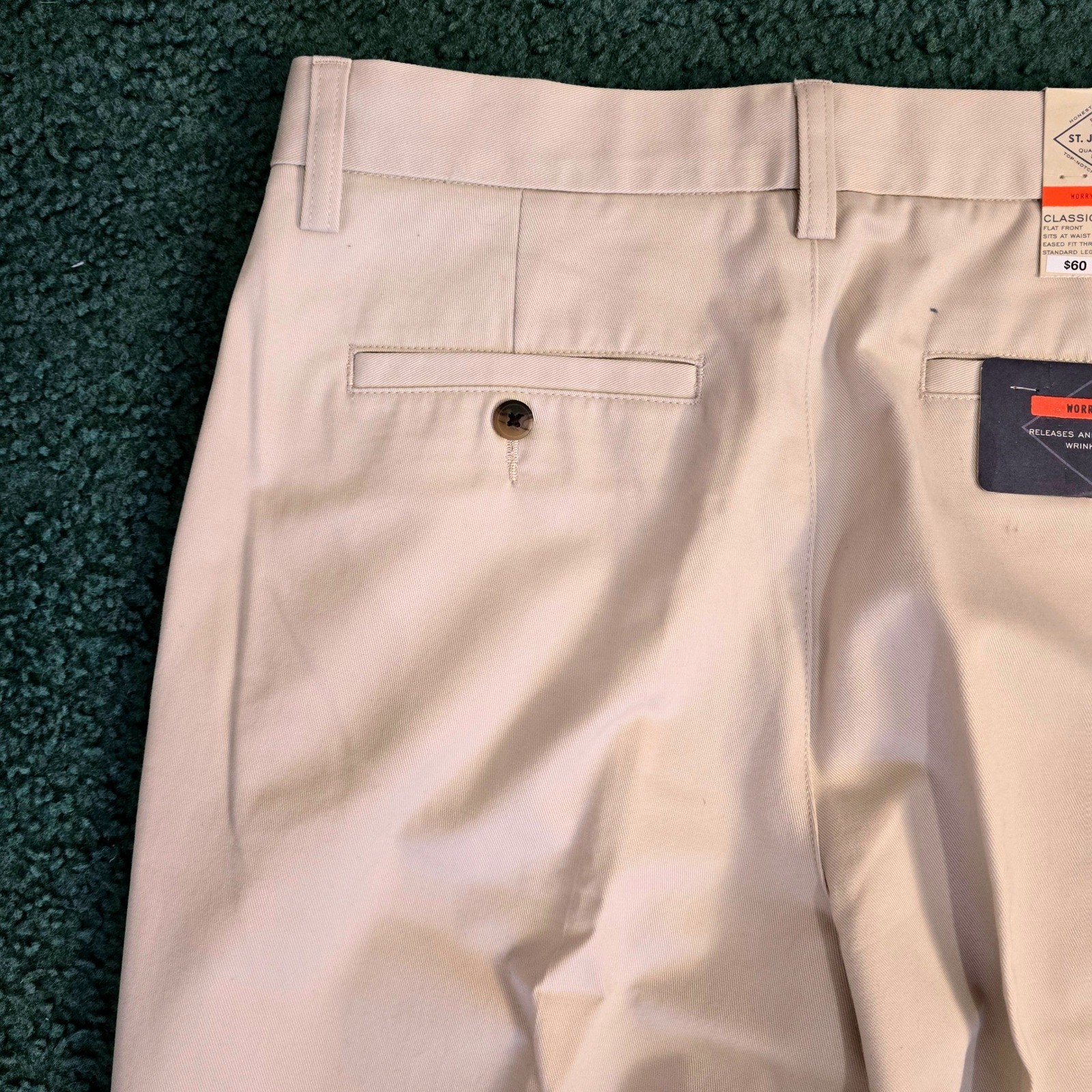 St Johns Bay Men's Worry Free Classic Fit Flat Front Pants 32x34 Stone Khaki NWT