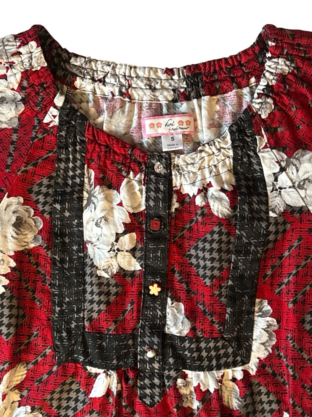 как выглядит Koi by Kathy Peterson Bella Scrub Top Red Black White Floral Novelty Buttons SM фото