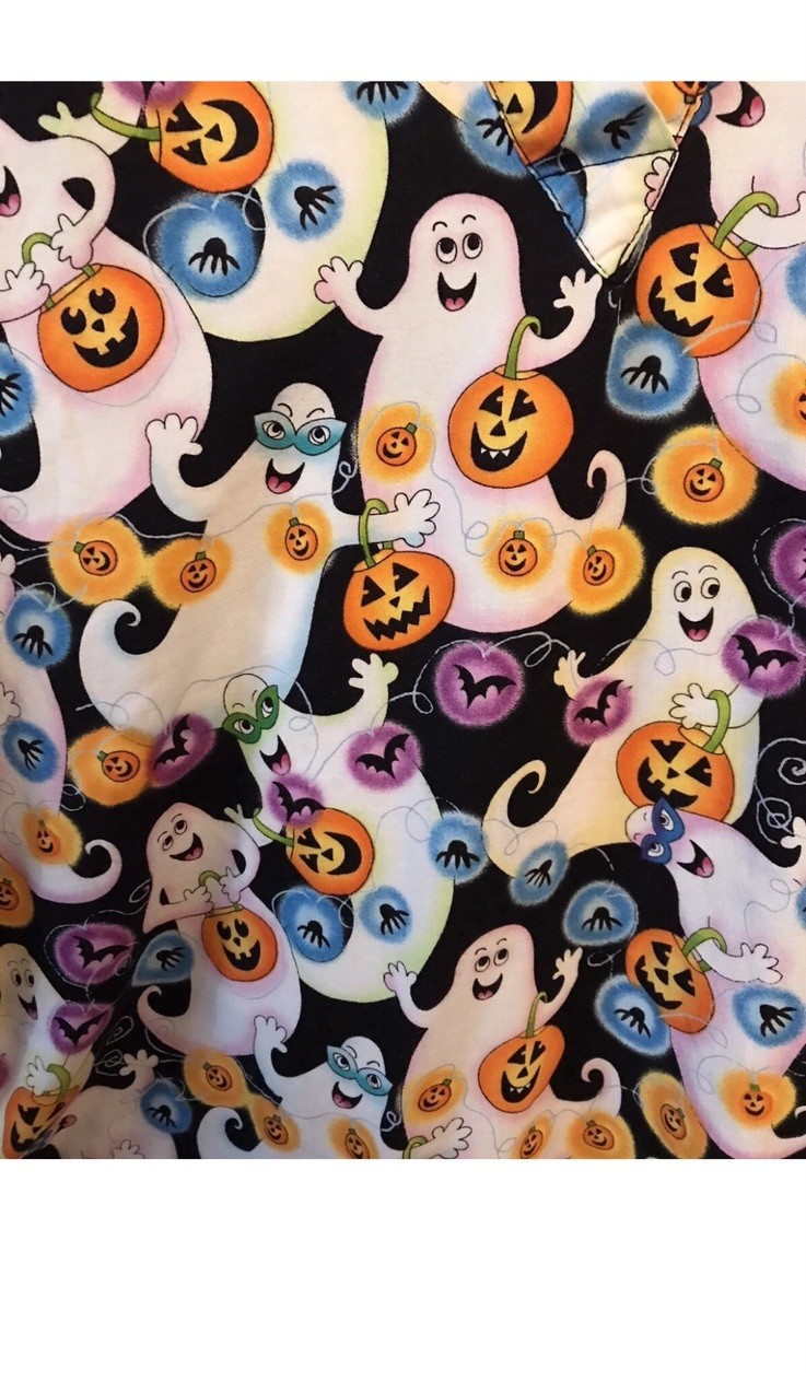 Peaches Womens Scrub Top M Halloween Ghosts Pumpkins Bats Cotton