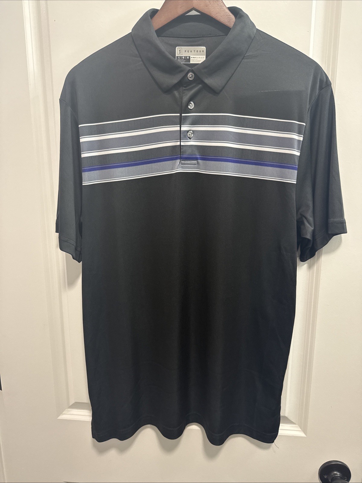 как выглядит PGA TOUR Pro Series Striped Polo Shirt Black Gray Mens Large Athletic Fit фото