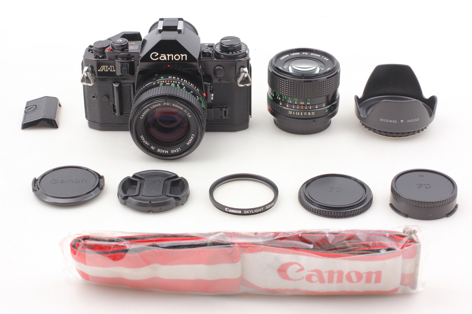 2 Lens MINT Canon A-1 Black SLR Film Camera NFD 50mm F1.4 24mm F2.8 JAPAN