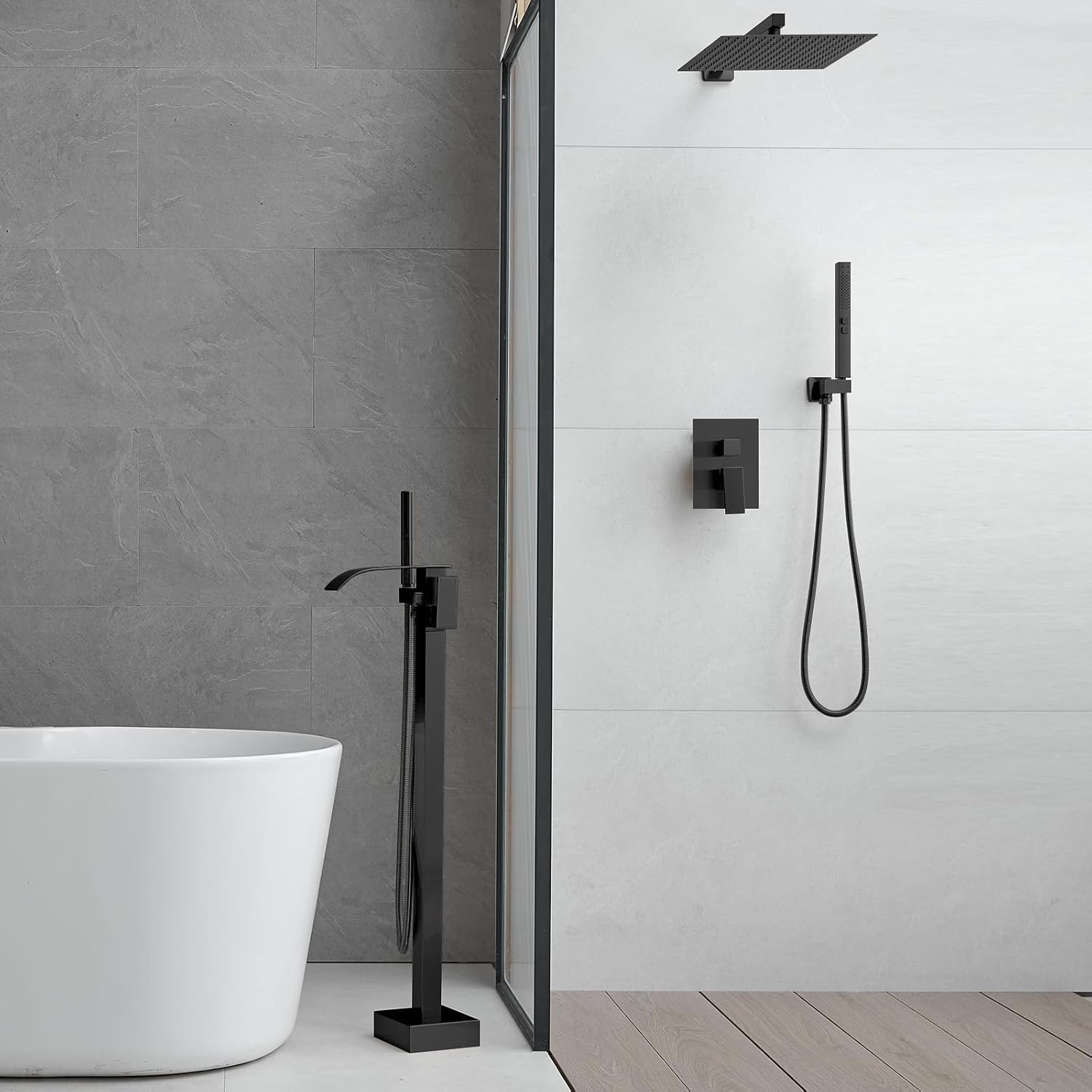 Matte Black Freestanding Tub Filler Faucet with Handheld Sprayer and Waterfall F
