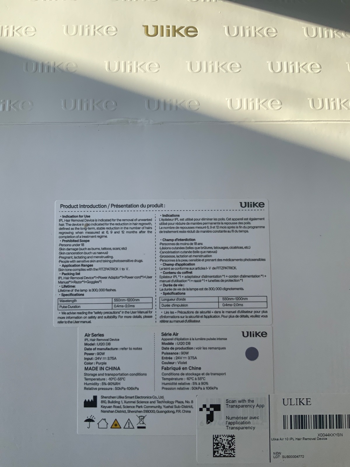Ulike Laser Air 10 IPL Hair Removal U120 DB 90W Electric Device Purple new