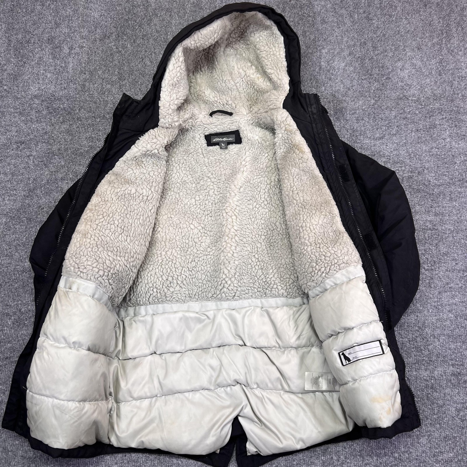 как выглядит Eddie Bauer Jacket Kids Medium 10/12 Black Hooded Down Parka Sherpa Lined фото