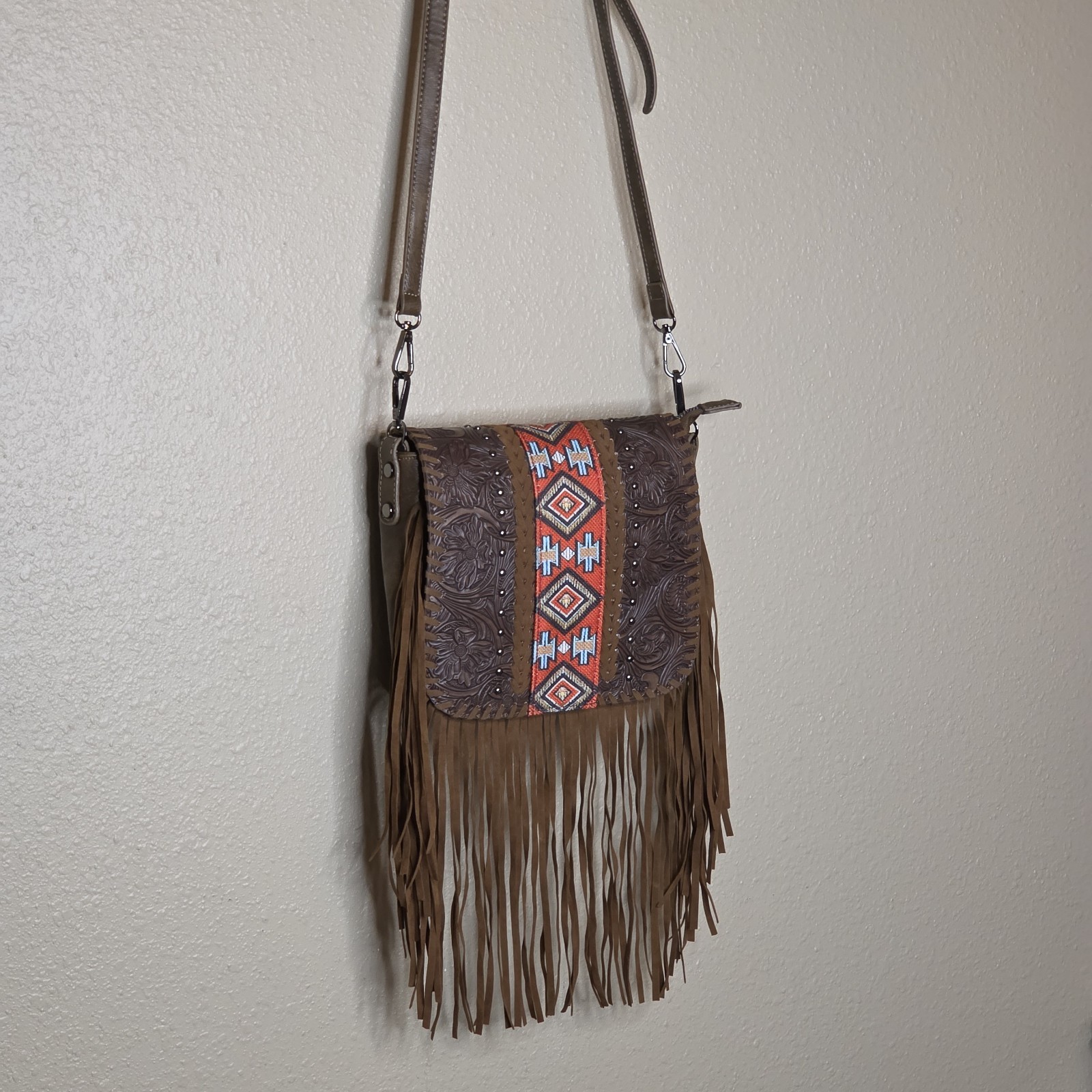 Brown Cross Body Bag Tooled Leather Fringe Purse Western Aztec - See ALL PHOTOS