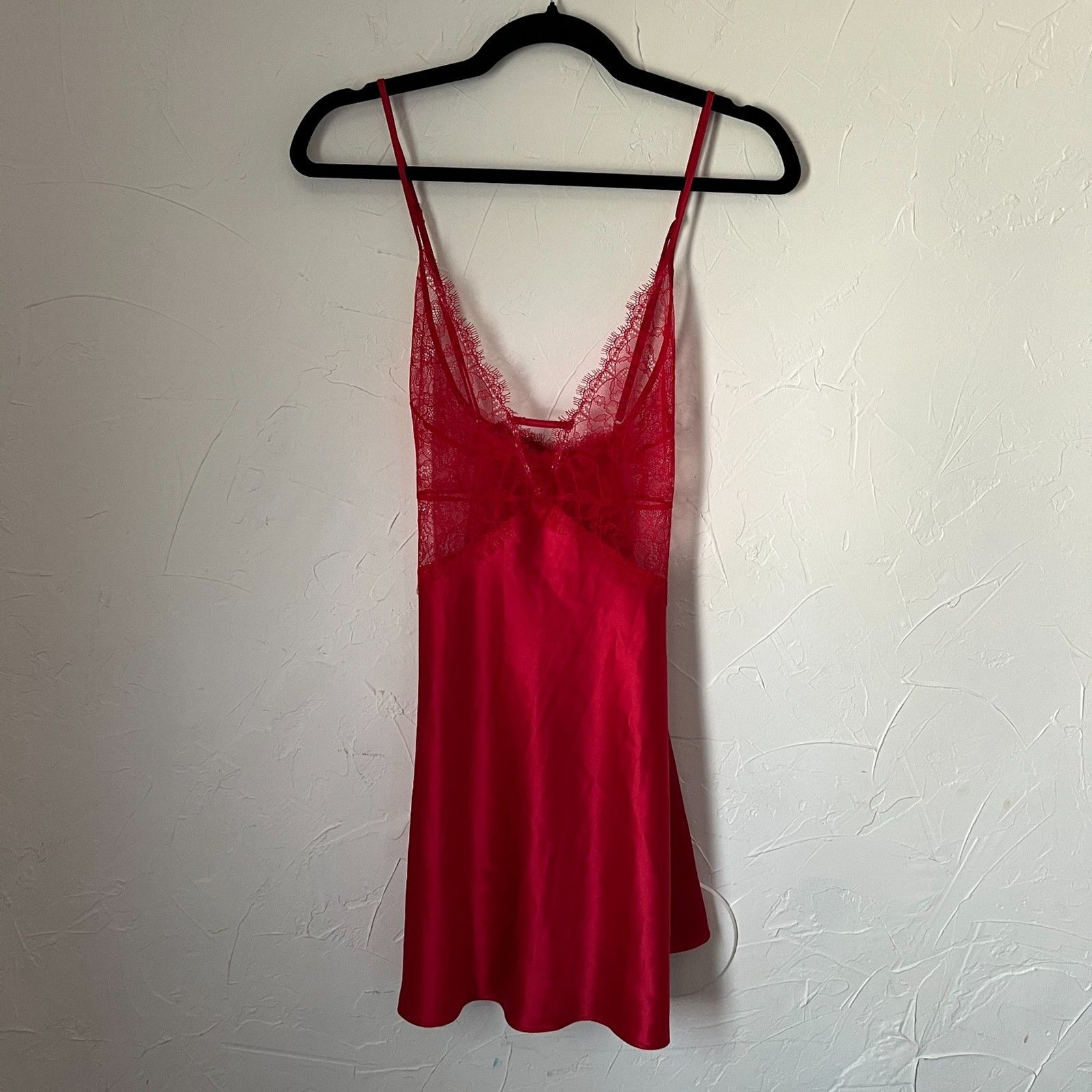 Victoria s Secret Red Lace Satin Slip Dress Coquette Romantic Cross Back Size L