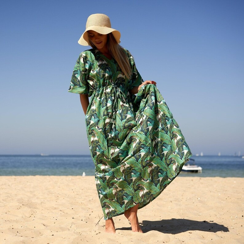 как выглядит Indian Green Leafs Handmade Cotton Kaftan Maxi Dress Womens Clothing Gown US фото