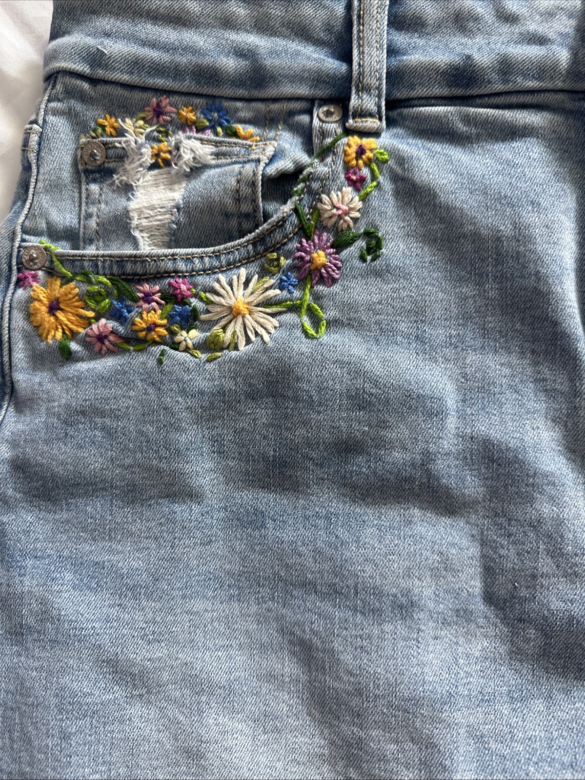 American Eagle Mini Skirt Jean skirt denim Hand Embroidery Y2K 90 s Hippie Sz 12
