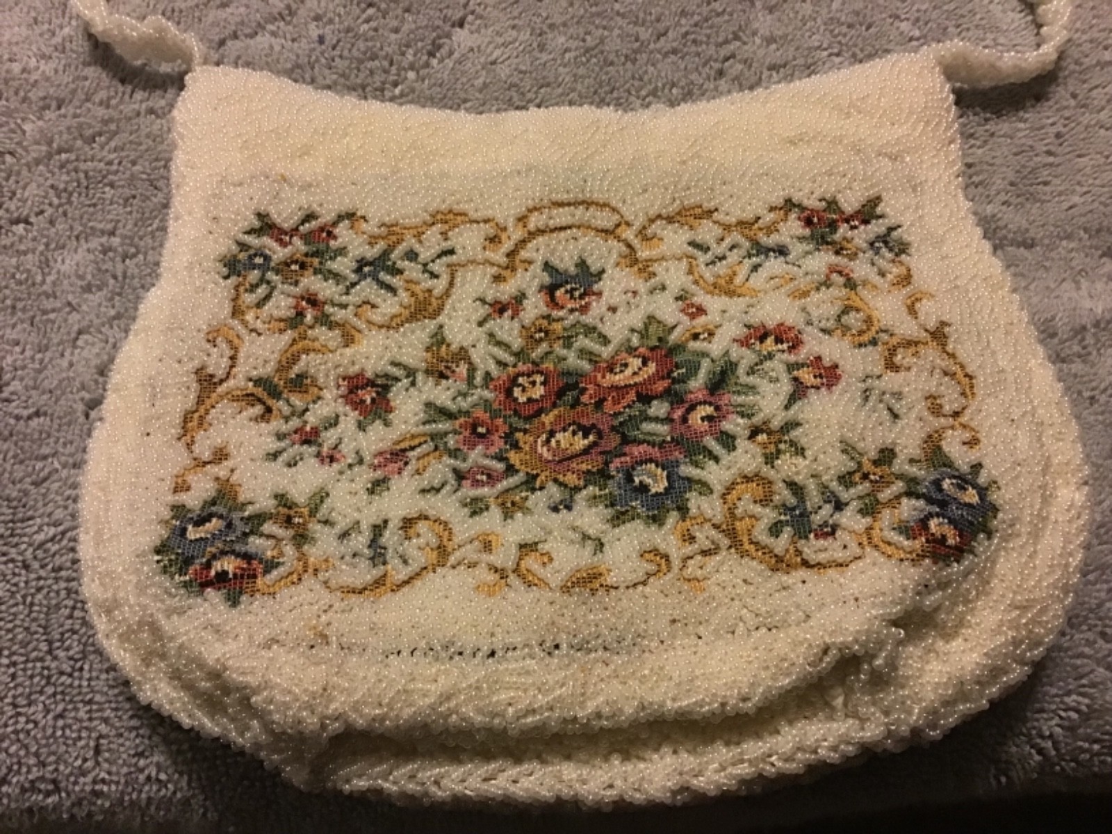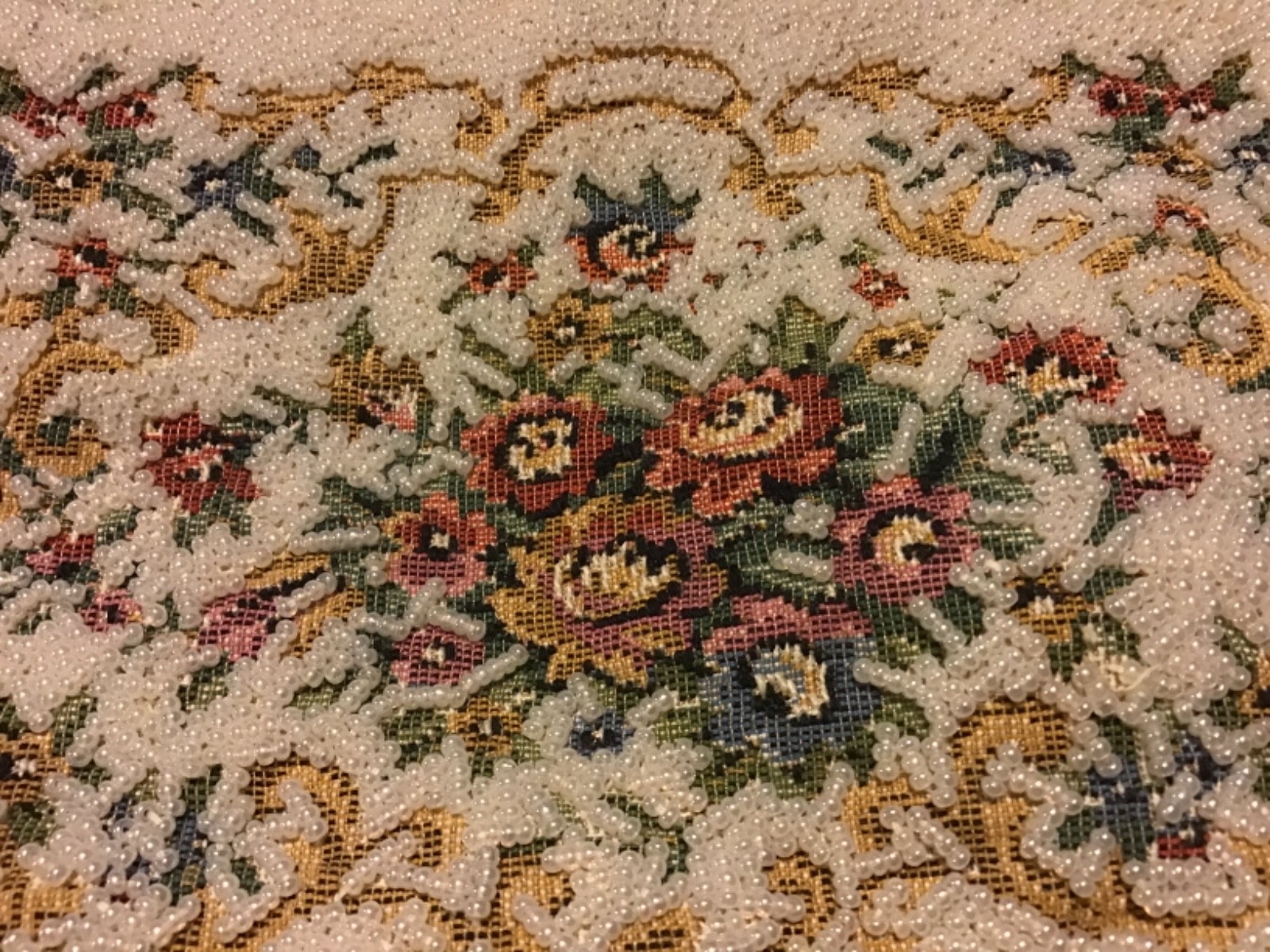 6 Vintage MAGID Pearl White Beaded Handbag with Kneedlepoint Flower Design