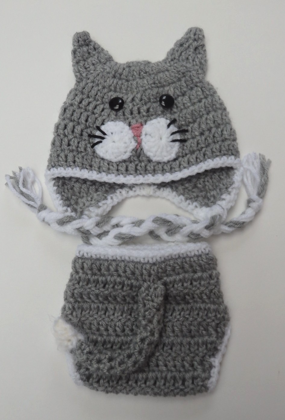 BABY HAT CAT DIAPER COVER SET CROCHET kitty infant toddler beanie photo prop