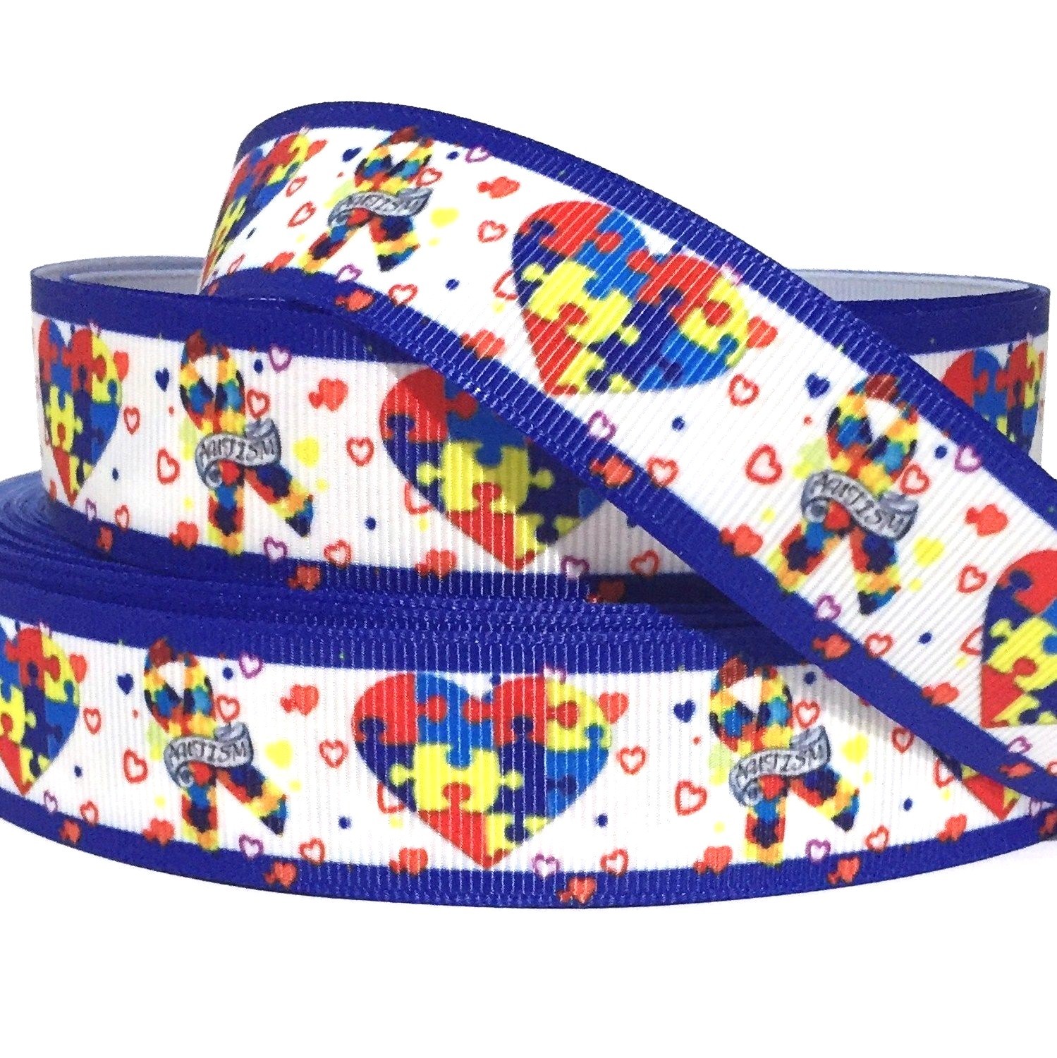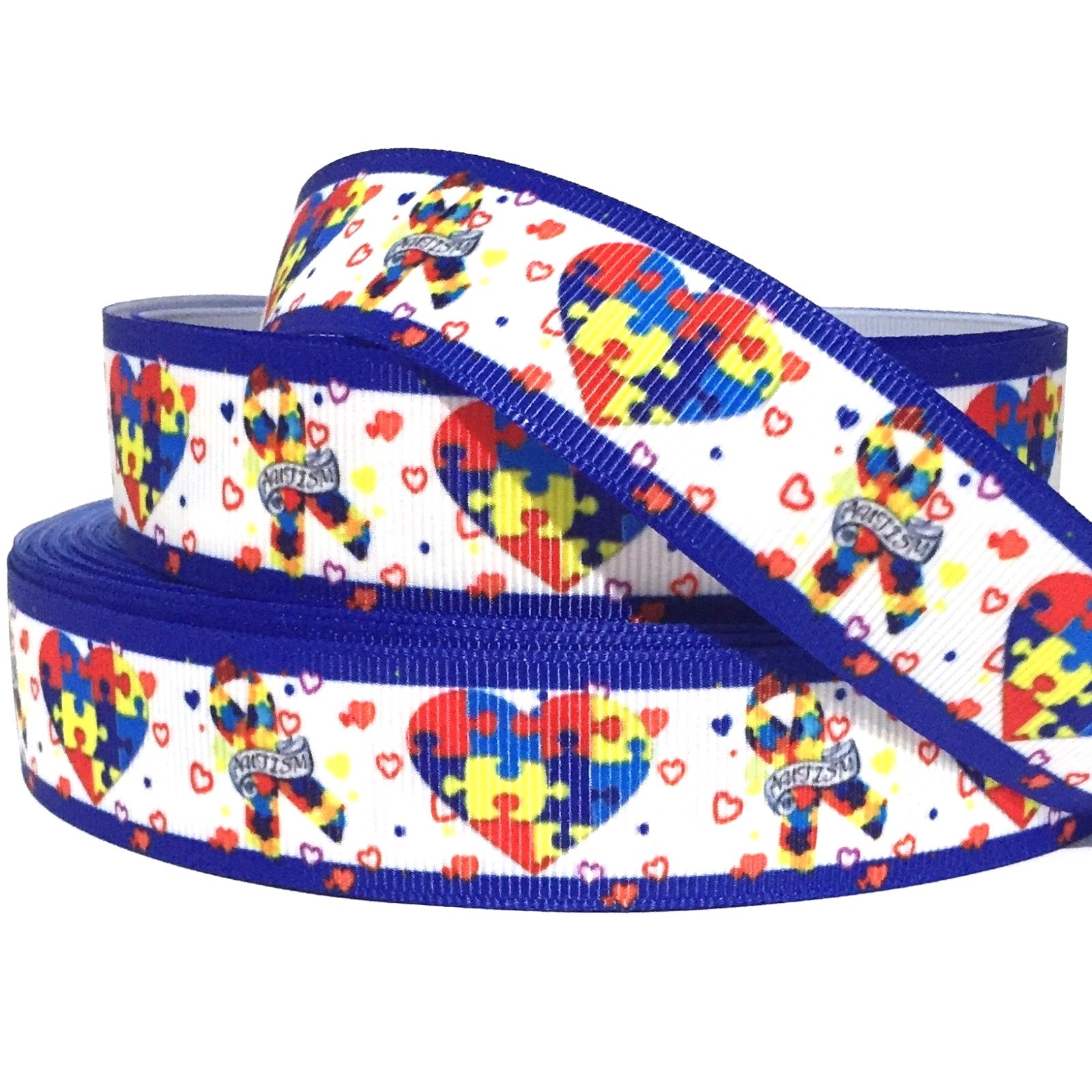GROSGRAIN RIBBON 5/8, 7/8, 1.5, 3 AUTISM AWARENESS PUZZLE HEARTS Printed
