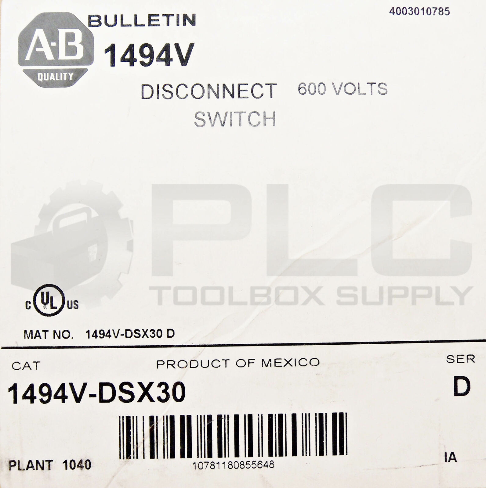 NEW ALLEN BRADLEY 1494V-DSX30 SER D DISCONNECT SWITCH 600V 1494VDSX30