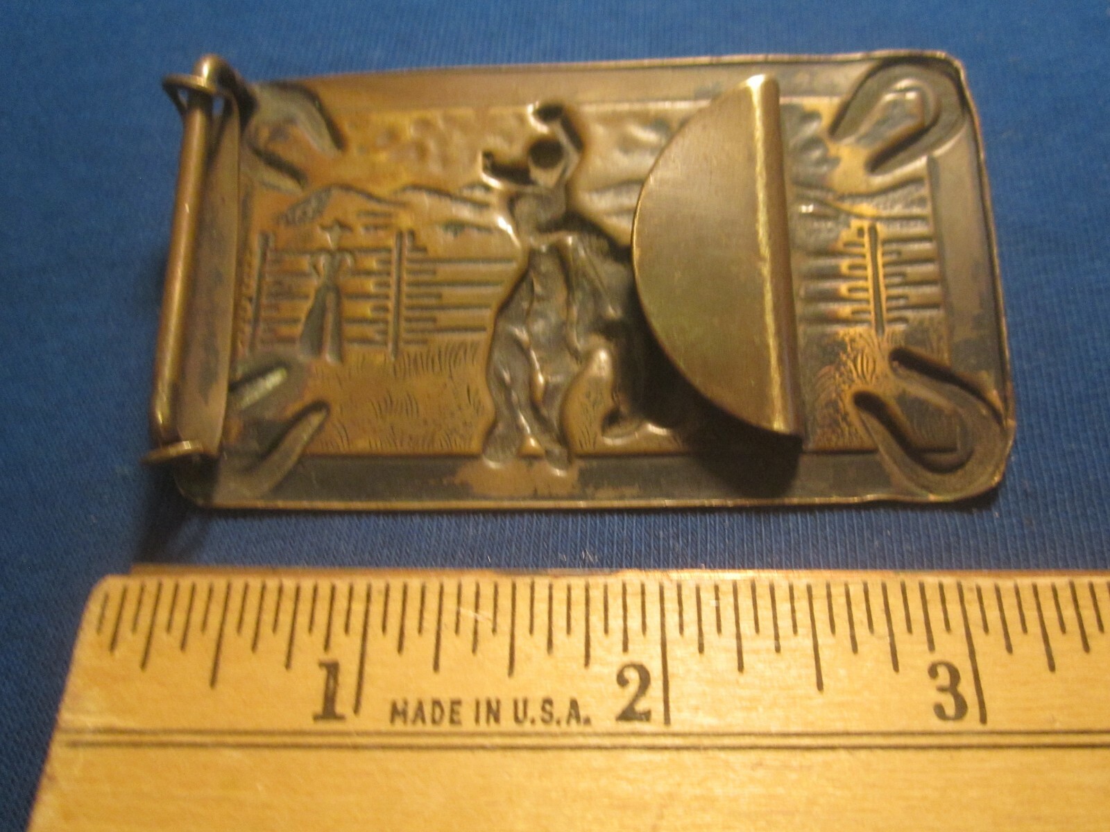 Vintage Metal Belt Buckle BRONC RIDER Rodeo BRASS c1950's j10j