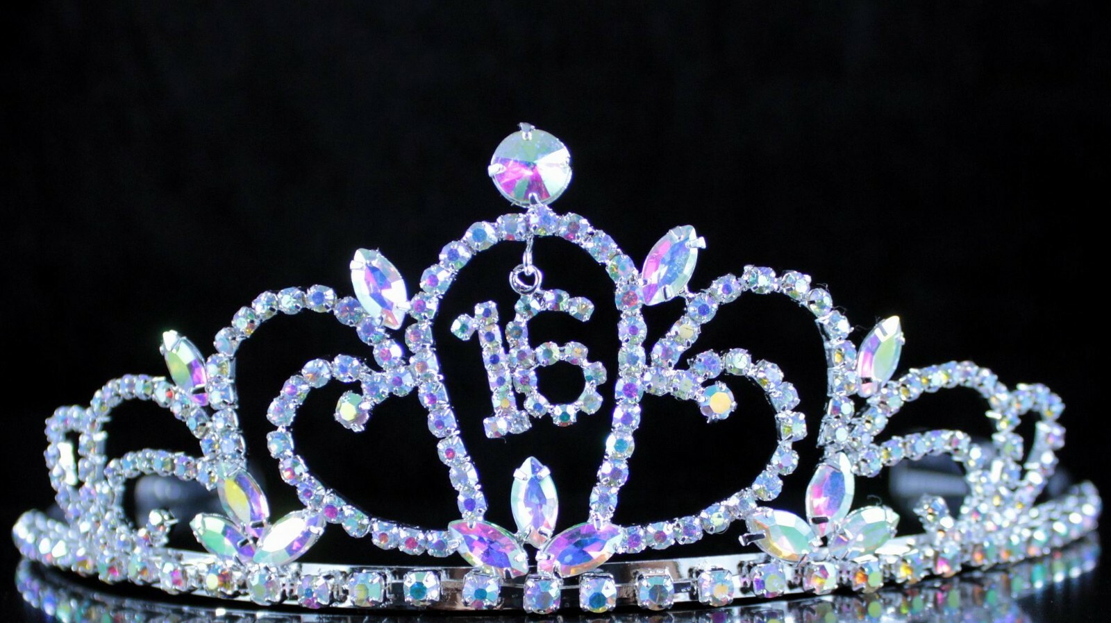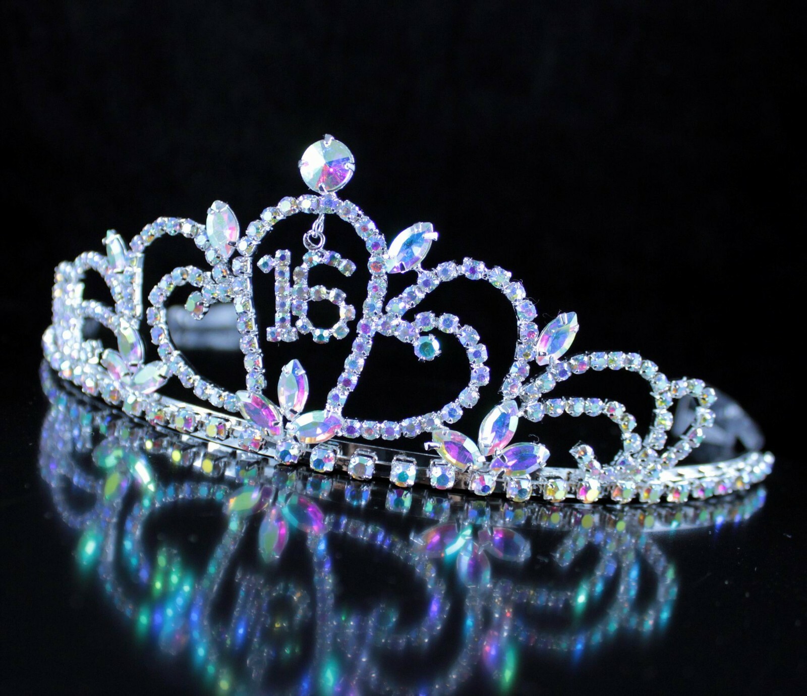 SWEET 16 SIXTEEN TIARA 16 CROWN WITH HAIR COMBS BIRTHDAY PARTY T1722AB WHITE AB