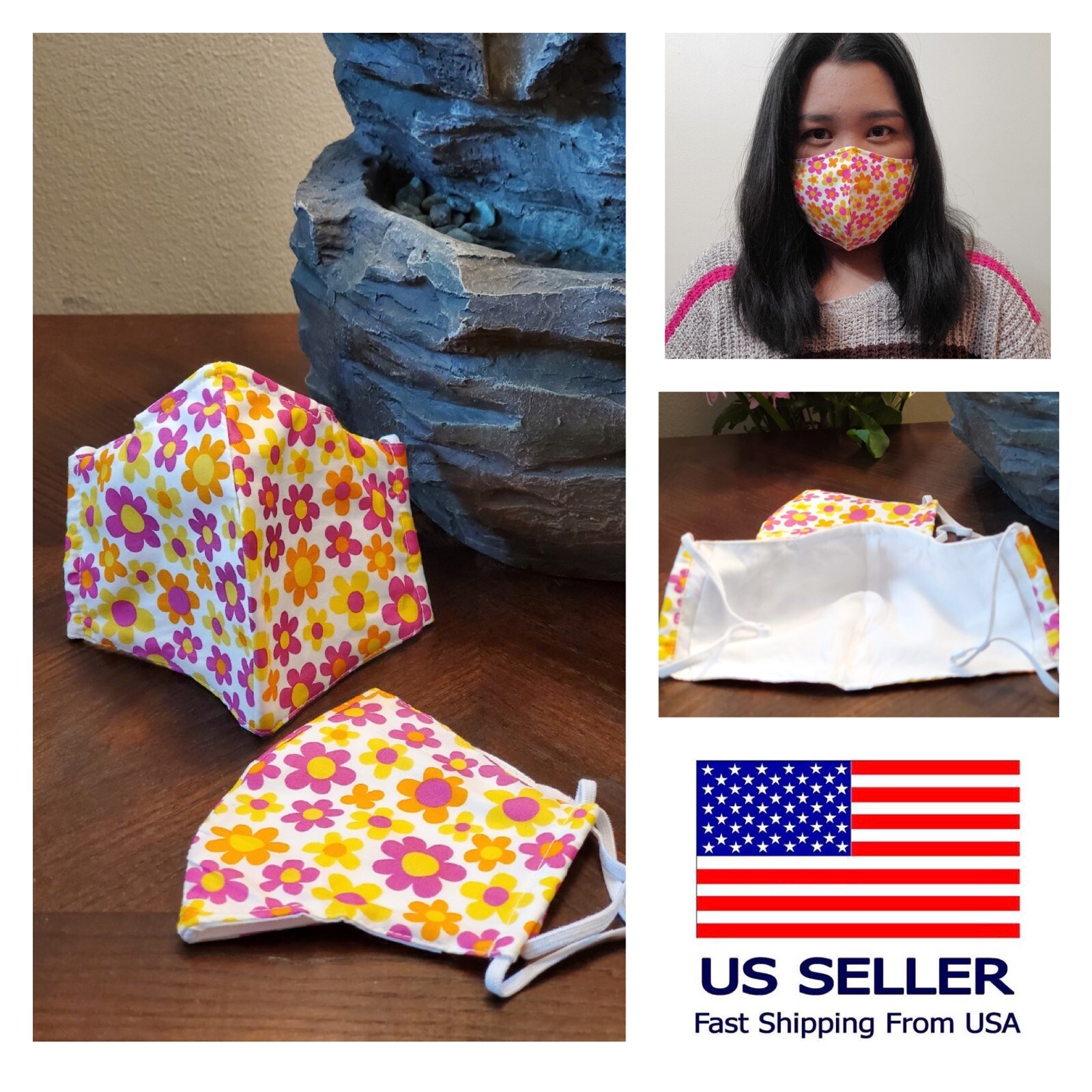 как выглядит 5 Pc Hand Made Cotton Face mask filter pocket nose wire Adjustable Yellow Floral фото