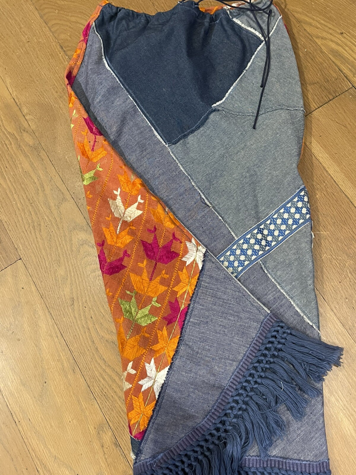 Vintage 70 s Denim and Embroidered Patchwork Bias Maxi Skirt M