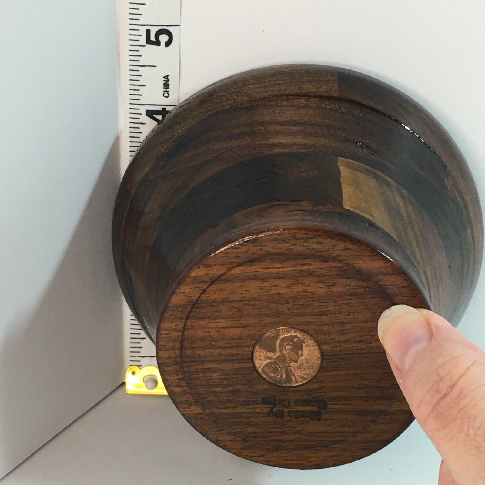как выглядит Wooden Bowl HANDCRAFTED 3" High 3" Base 4 5/8" Opening 1995 Penny in bottom Crim фото