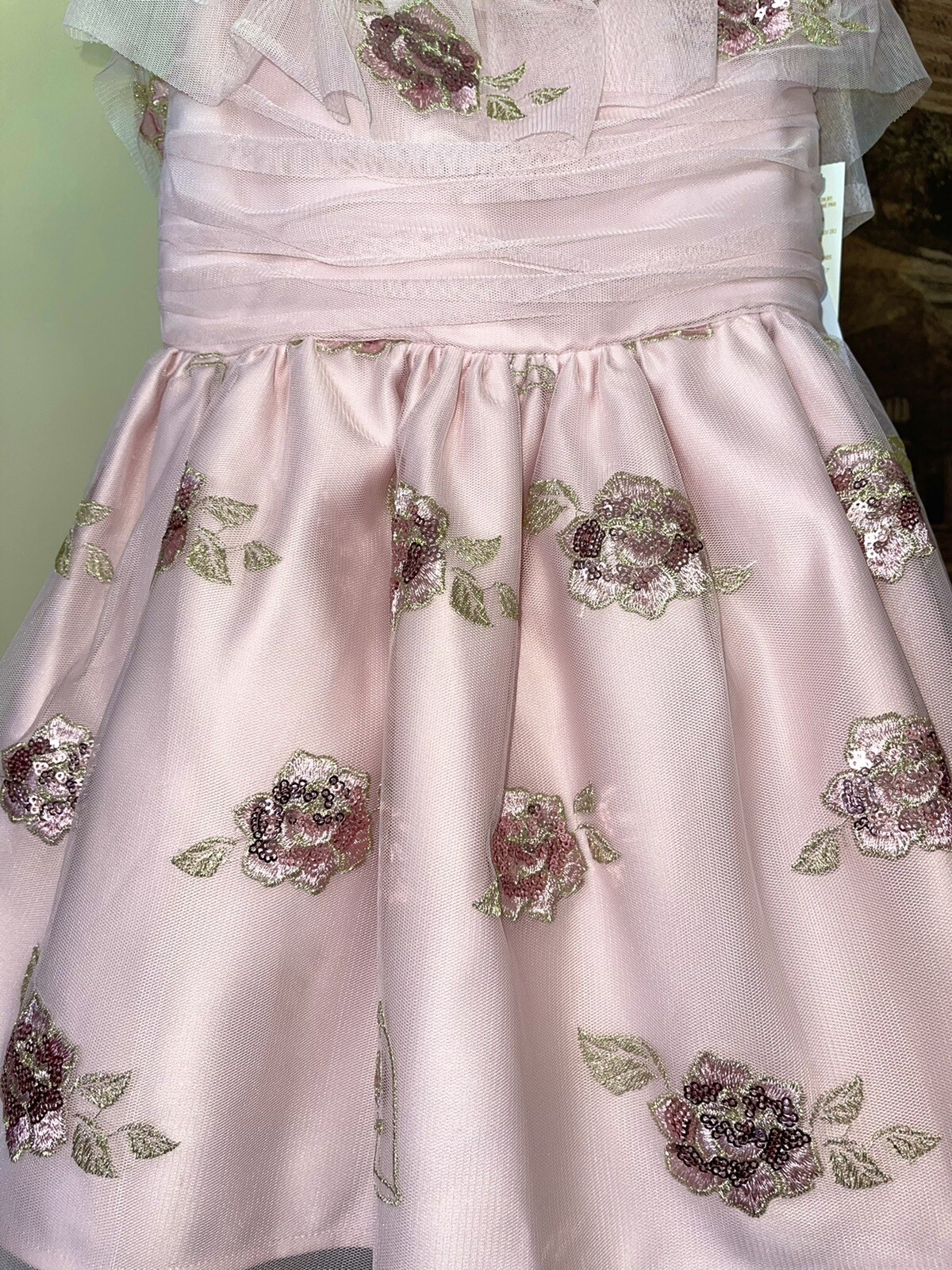 Accents: Zipper, Embroidered, Strap, Ruffle, Sequin-rose appliqués with gold thread leaves
