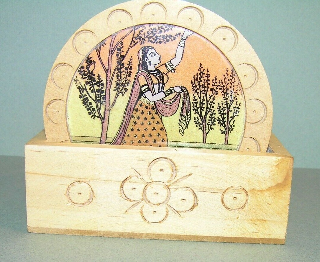 как выглядит Round 6 Pc. Coasters Set W/ Hand Tooled Wooden Box Holder фото