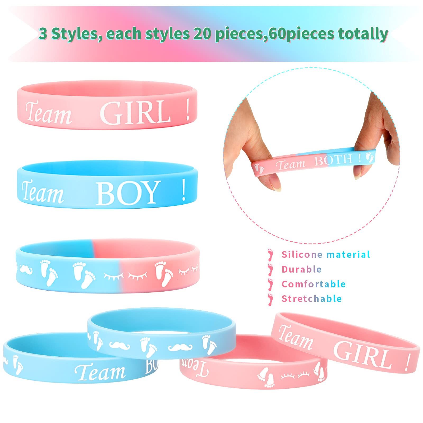 60PCS Gender Reveal Party Rubber Bracelets Boy or Girl Baby Shower Party Supply