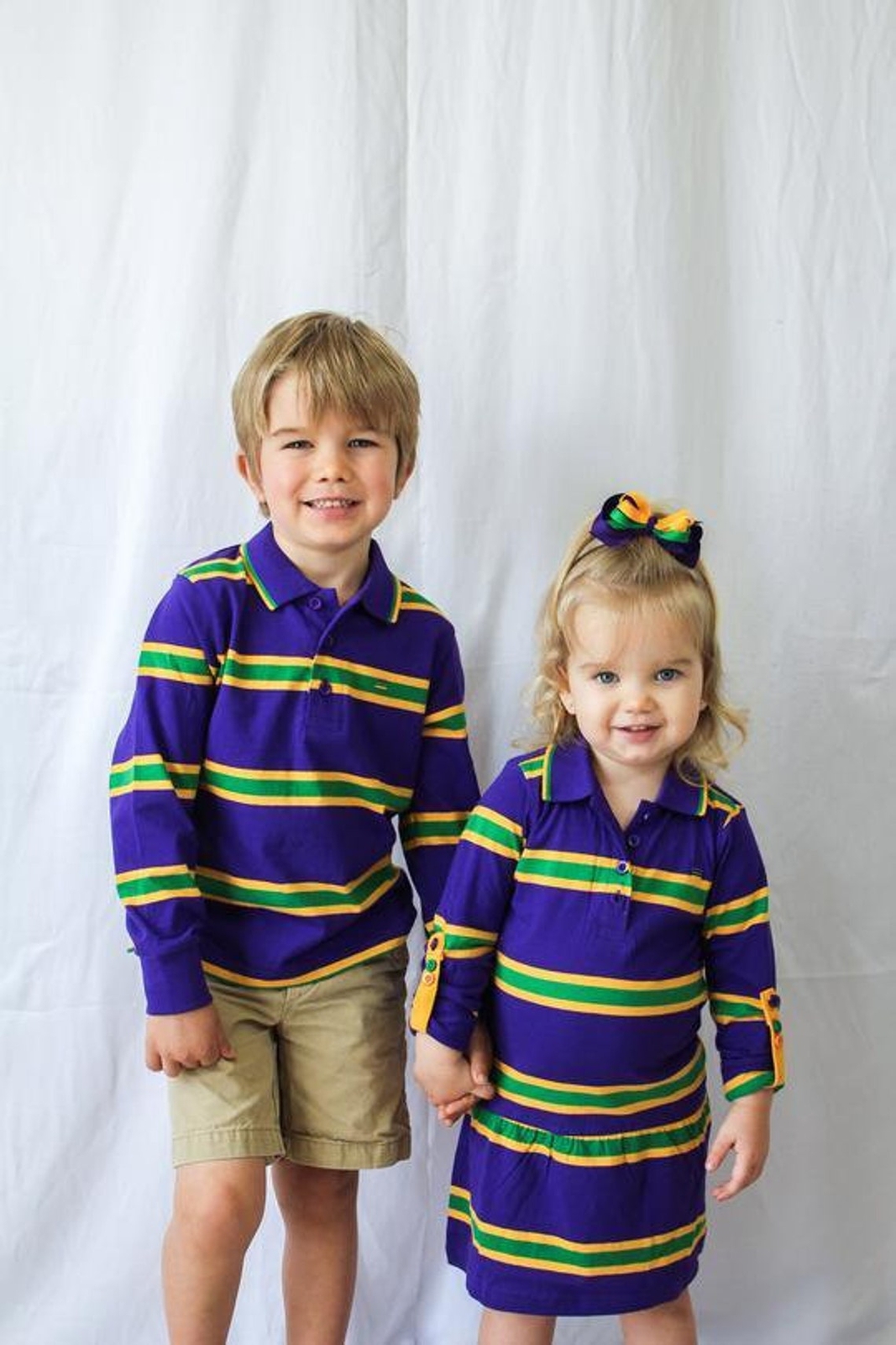как выглядит Mardi Gras Kids Unisex Long Sleeve Purple Polo Shirt With Green and Gold Stripes фото