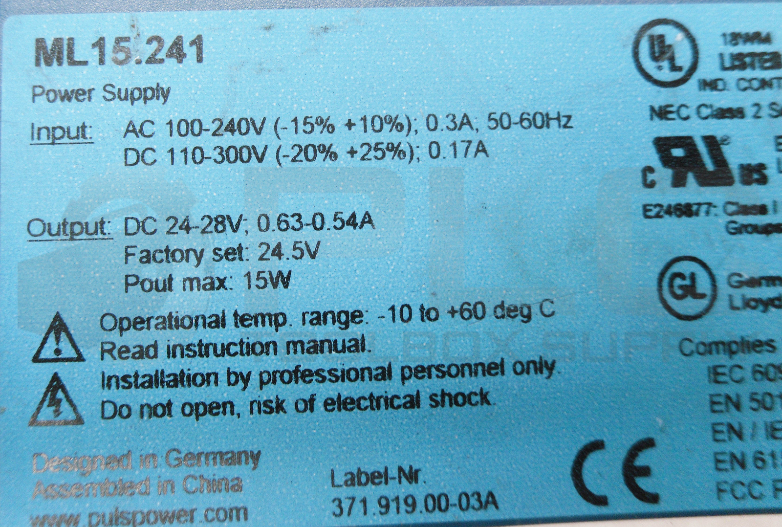 PULS ML15.241 POWER SUPPLY 100-240VAC 50-60HZ 110-300VDC 0.3A
