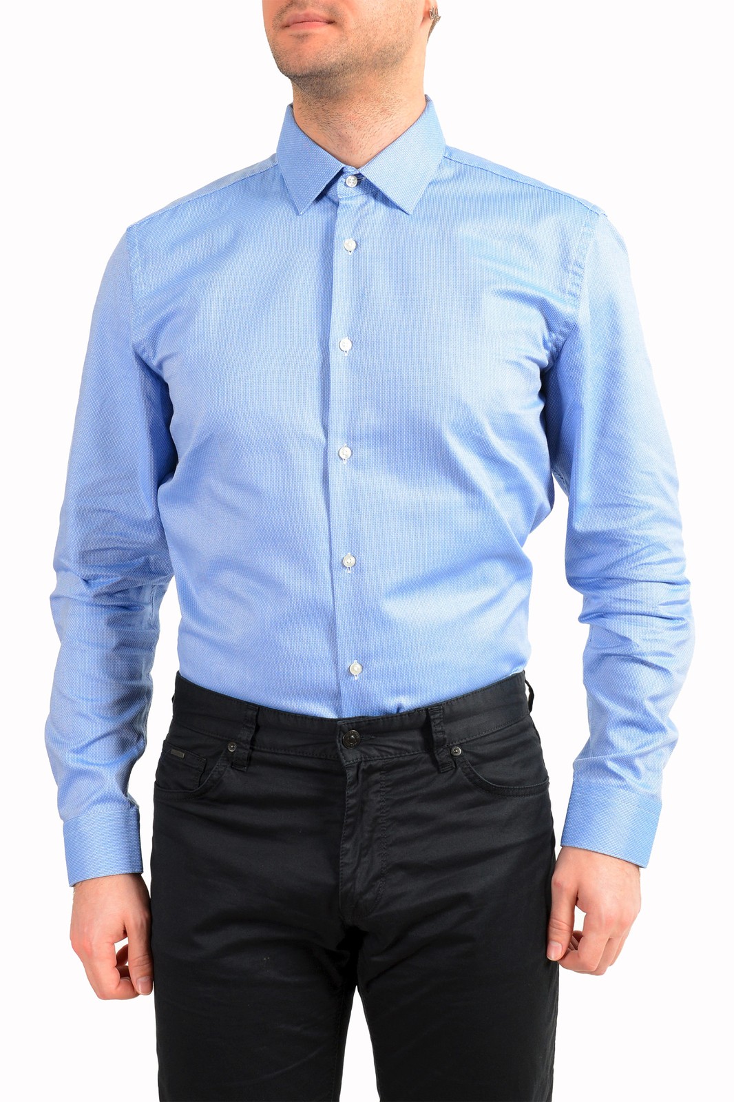 как выглядит Hugo Boss Mens "Isko" Blue Slim Fit Geometric Print Long Sleeve Dress Shirt фото