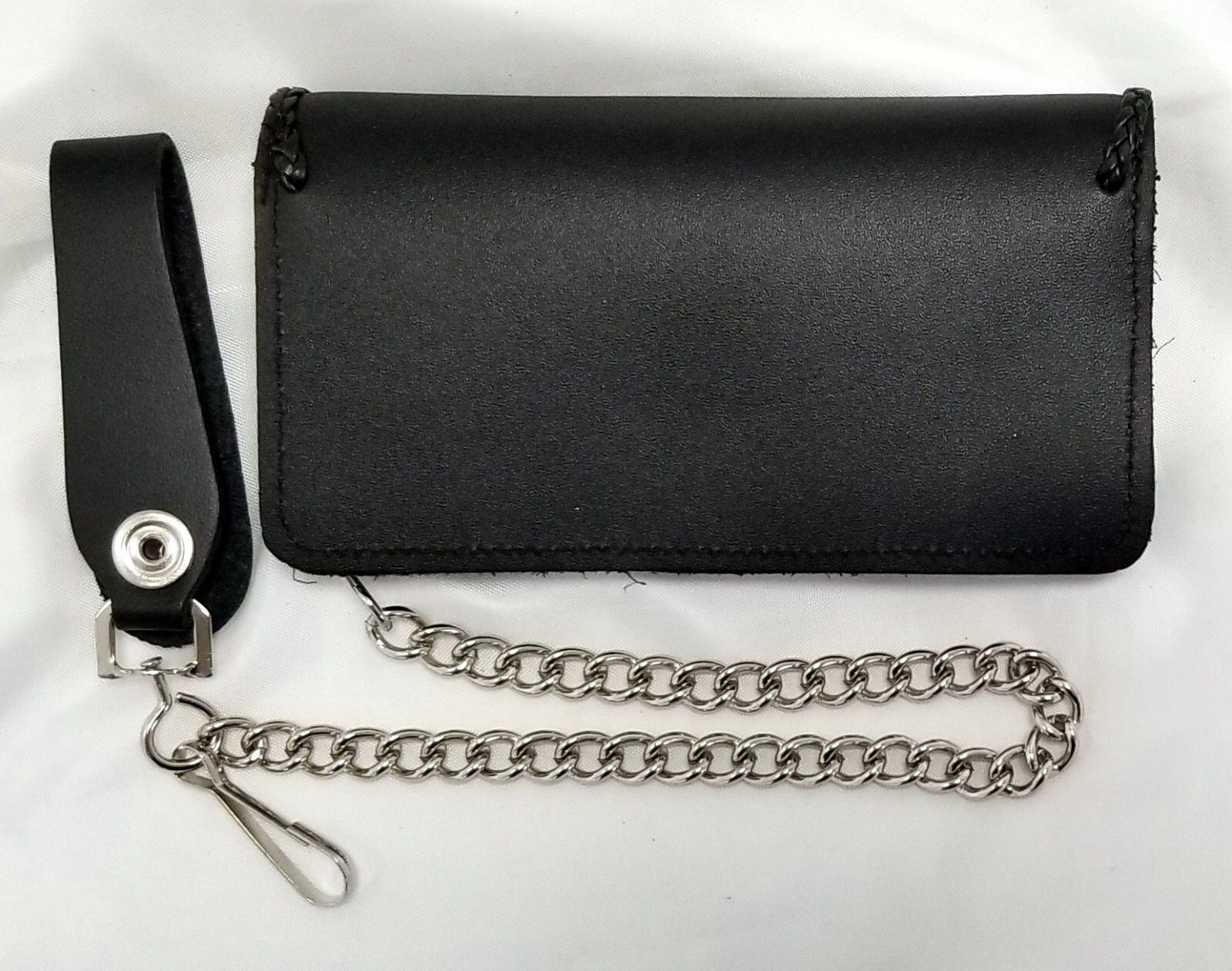 Black Leather Trucker Wallet Braided Trim 6 x 3.5 With 12 Chain MADE IN USA