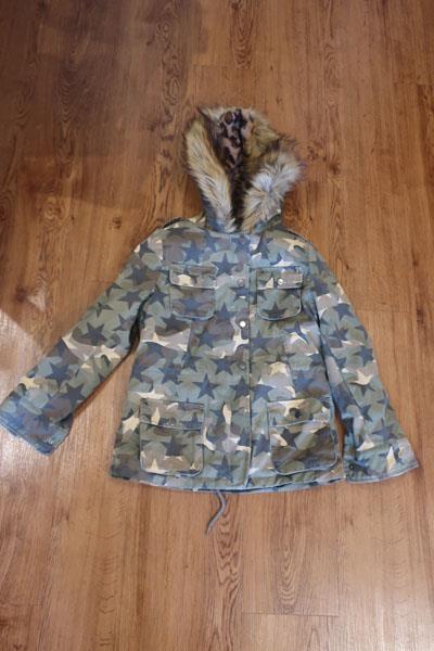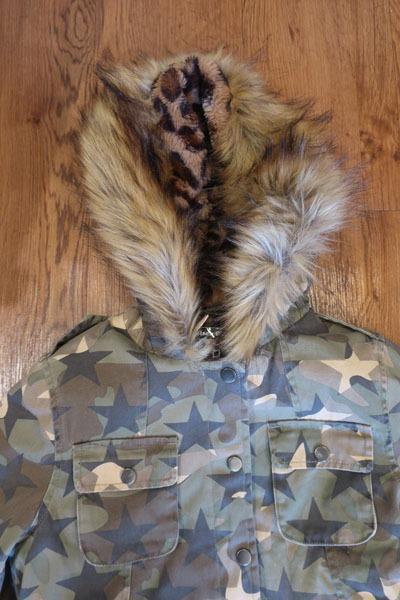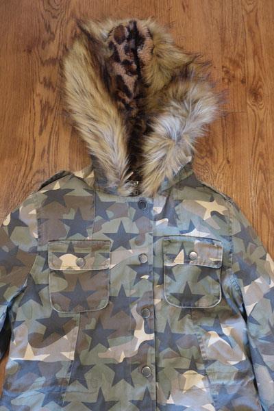 Girls Vintage Havana Green Brown Camo Faux Fur Hood Trim Jacket L
