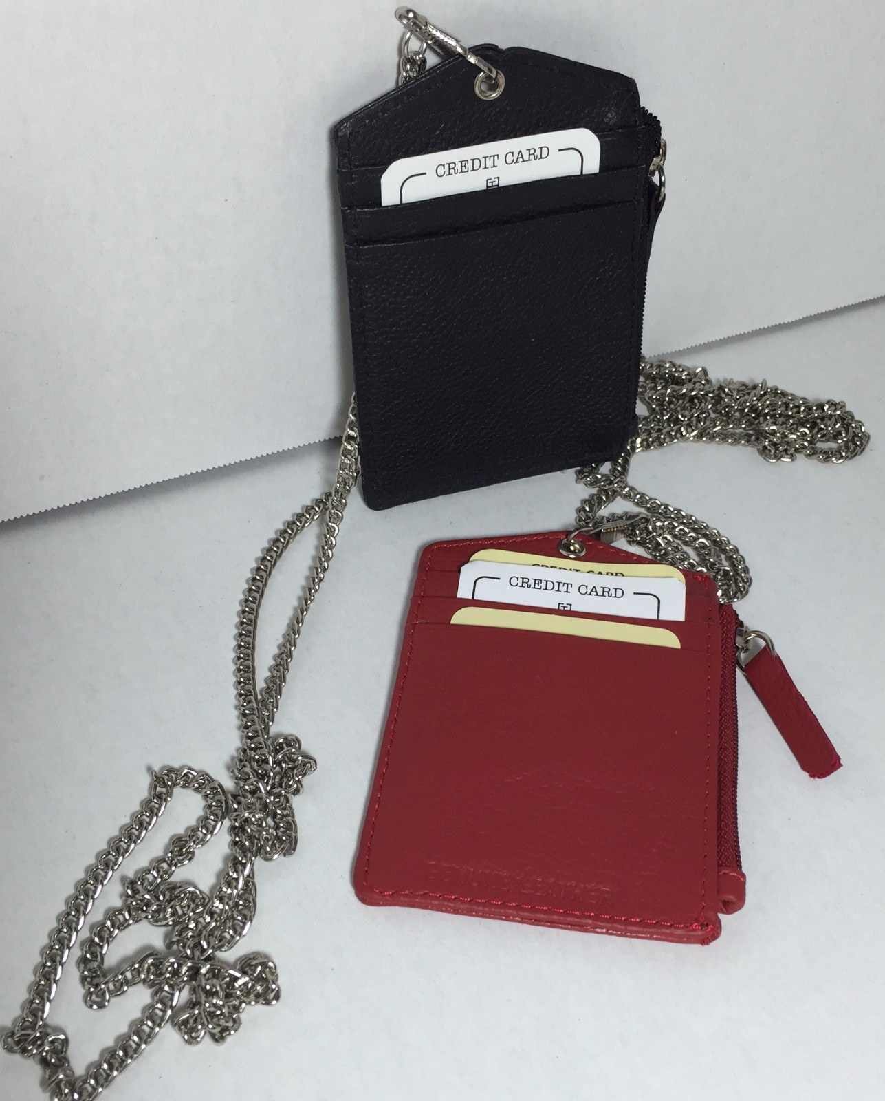 NEW SET OF 2 LEATHER ID BADGE HOLDER RED/BLACK ZIPPERED LANYARD WITH NECK CHAIN