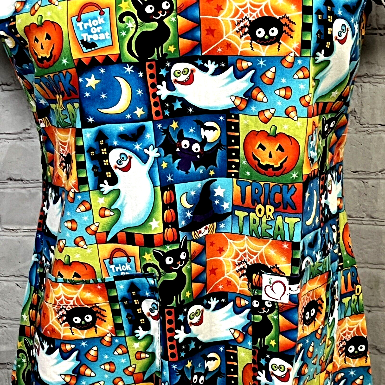 как выглядит Peaches Size Meduim Multi Color Jack-O-Lantern Ghost W V Neck Pockets Scrub Top фото