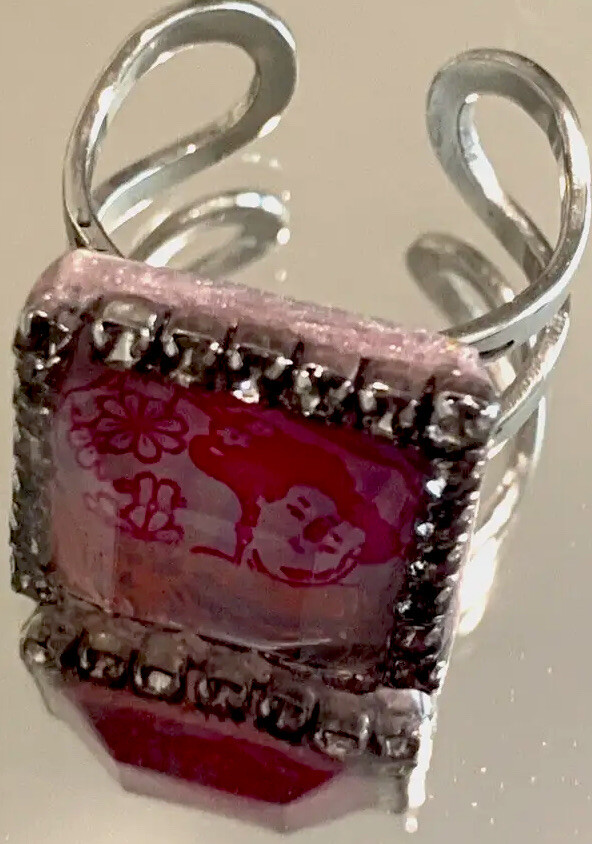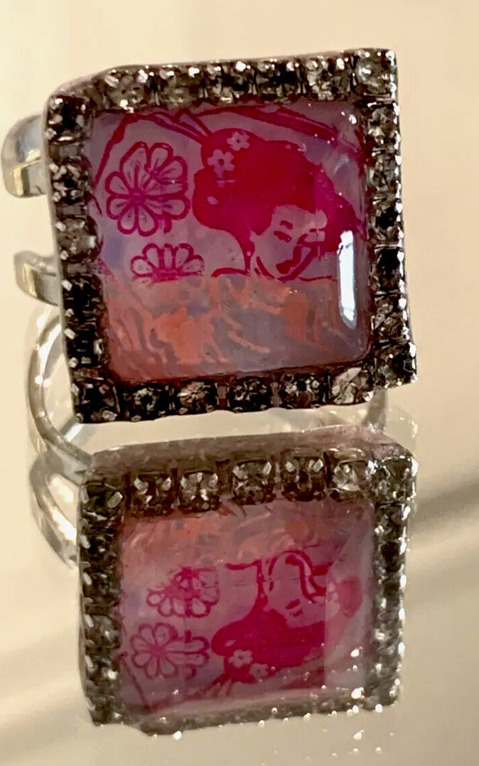 Handcrafted Art Resin Adjustable Stainless Steel Open Ring, Geisha, Rhinestones