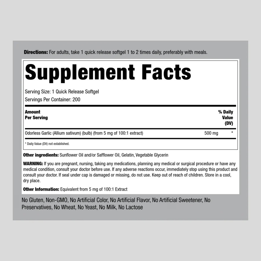 Odorless Garlic Softgels 500mg 200 Pills Non-GMO By Piping Rock