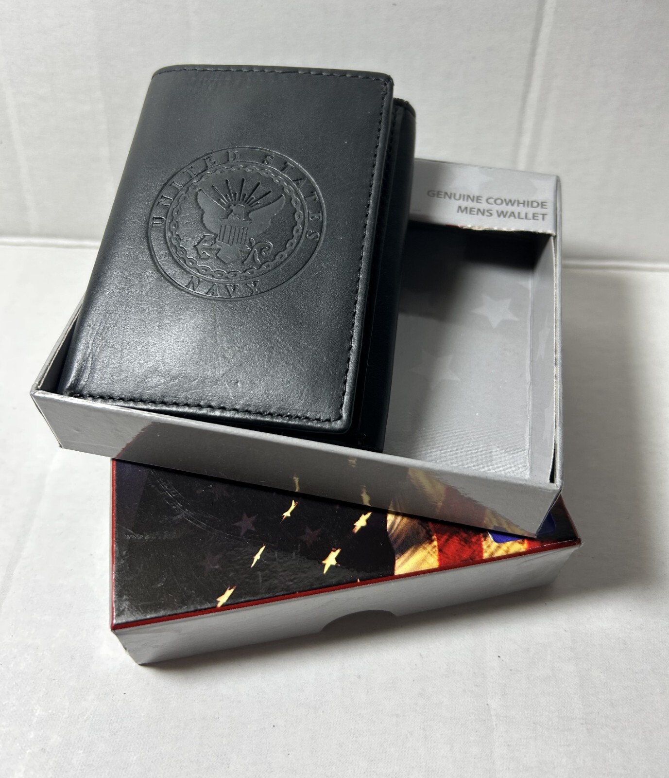 как выглядит U.S Navy cowhide leather men trifold wallet black embossed New in box фото