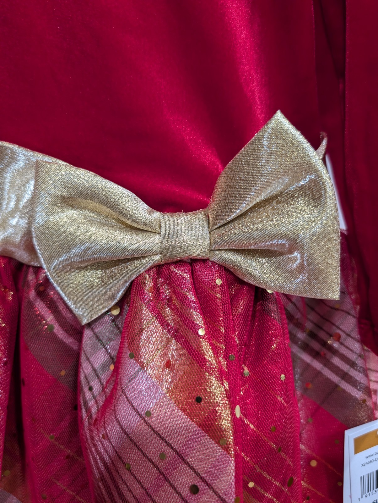 как выглядит Bonnie Jean Girls Christmas Holiday Santa Plaid Gold Bow Multi Red Velvet Dress фото