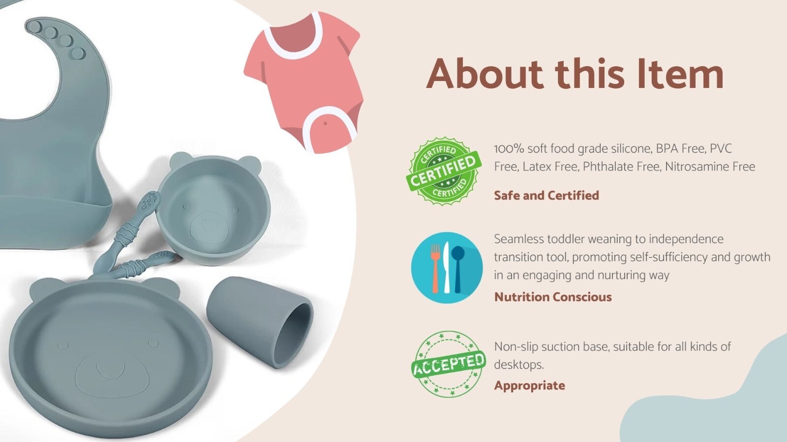 Set Includes: Bowl, Cup, Fork, Plate, Spoon, bib, silicone