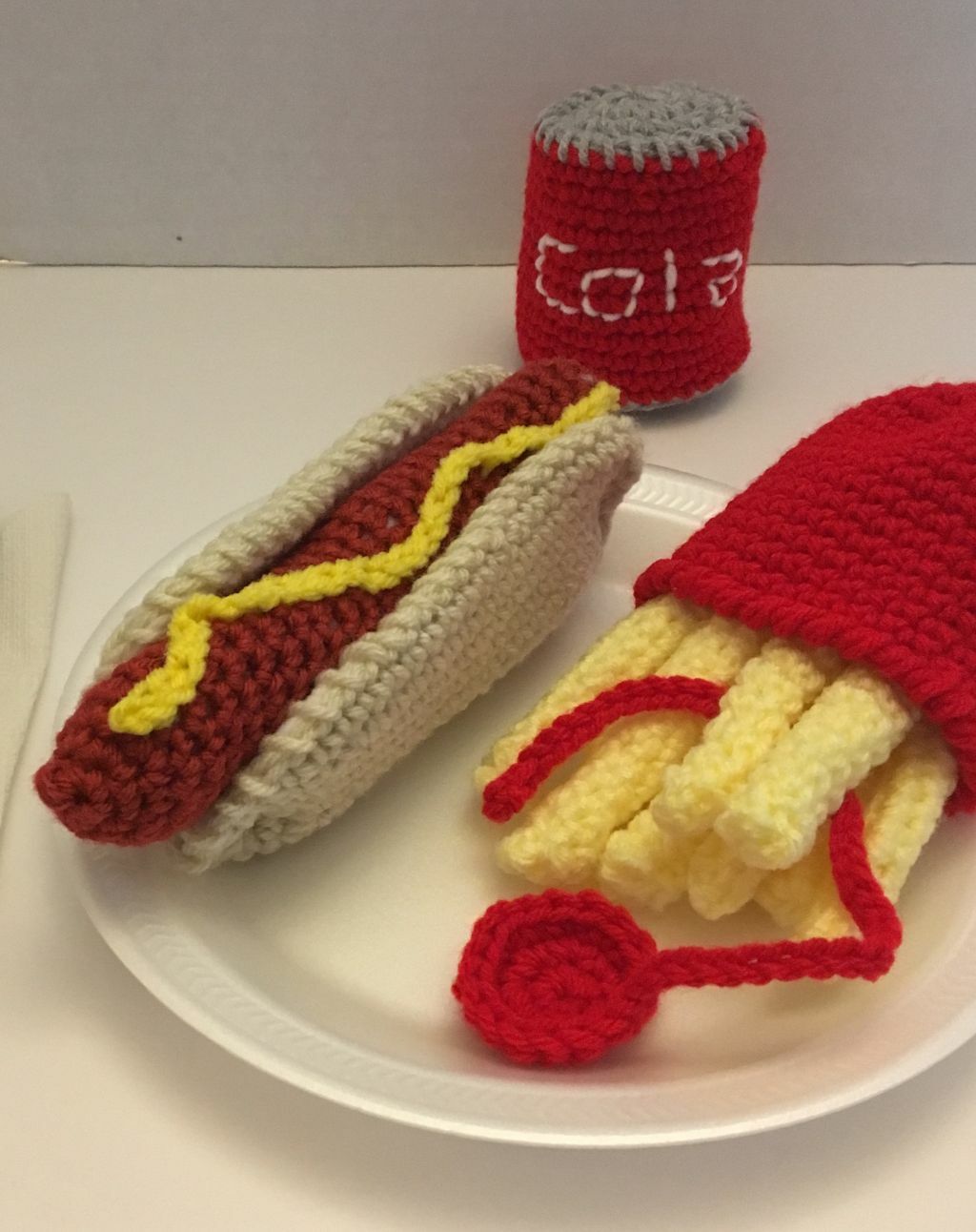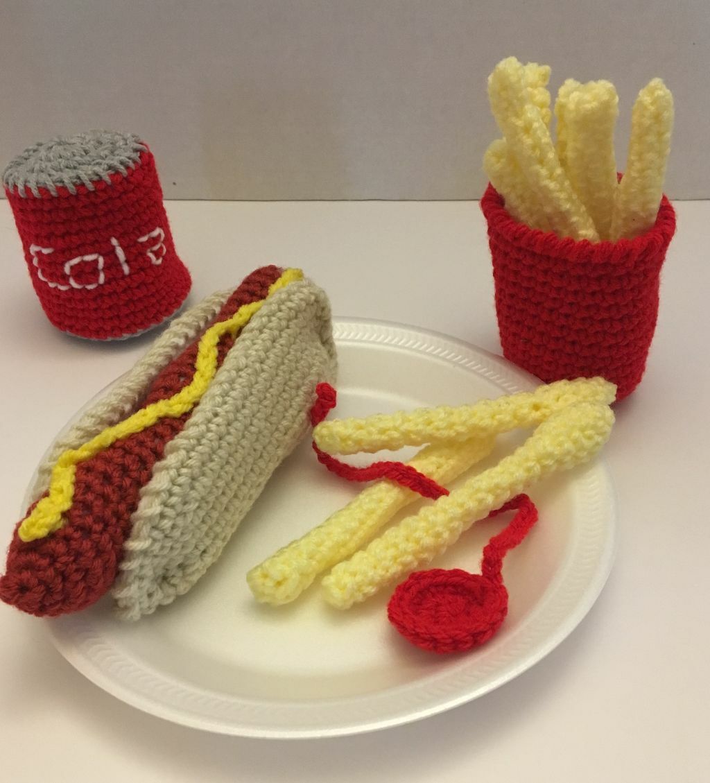 Play food Hot dog meal, fries, soda, Crochet Soft Food Play, Free shipping
